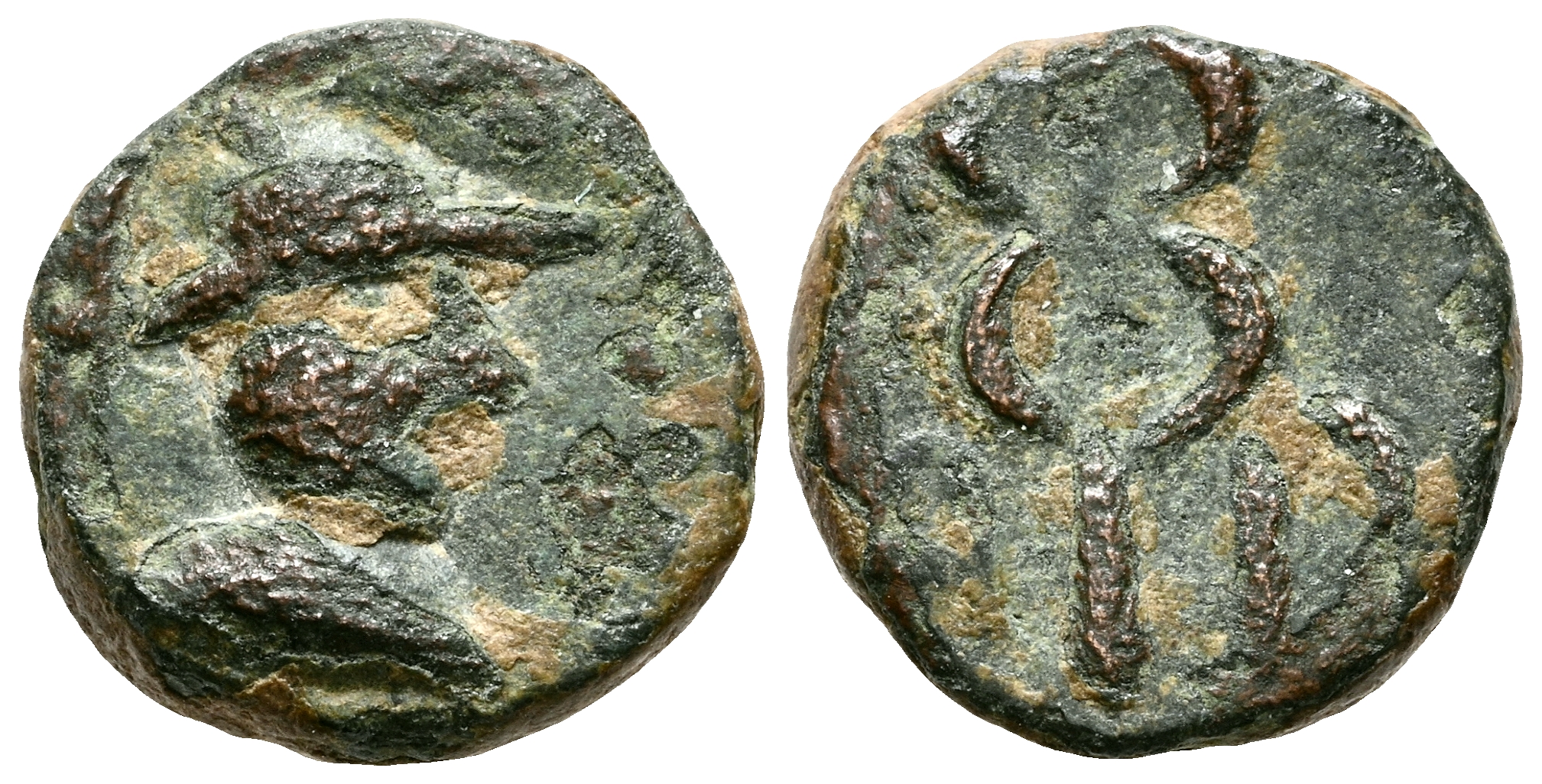 CARMO (Carmona, Sevilla). Cuadrante. (Ae. 1,21g/10mm). 80 a.C. (FAB-473). Anv: Cabeza de Mercurio a derecha. Rev: Caduceo. MBC. Escasa.