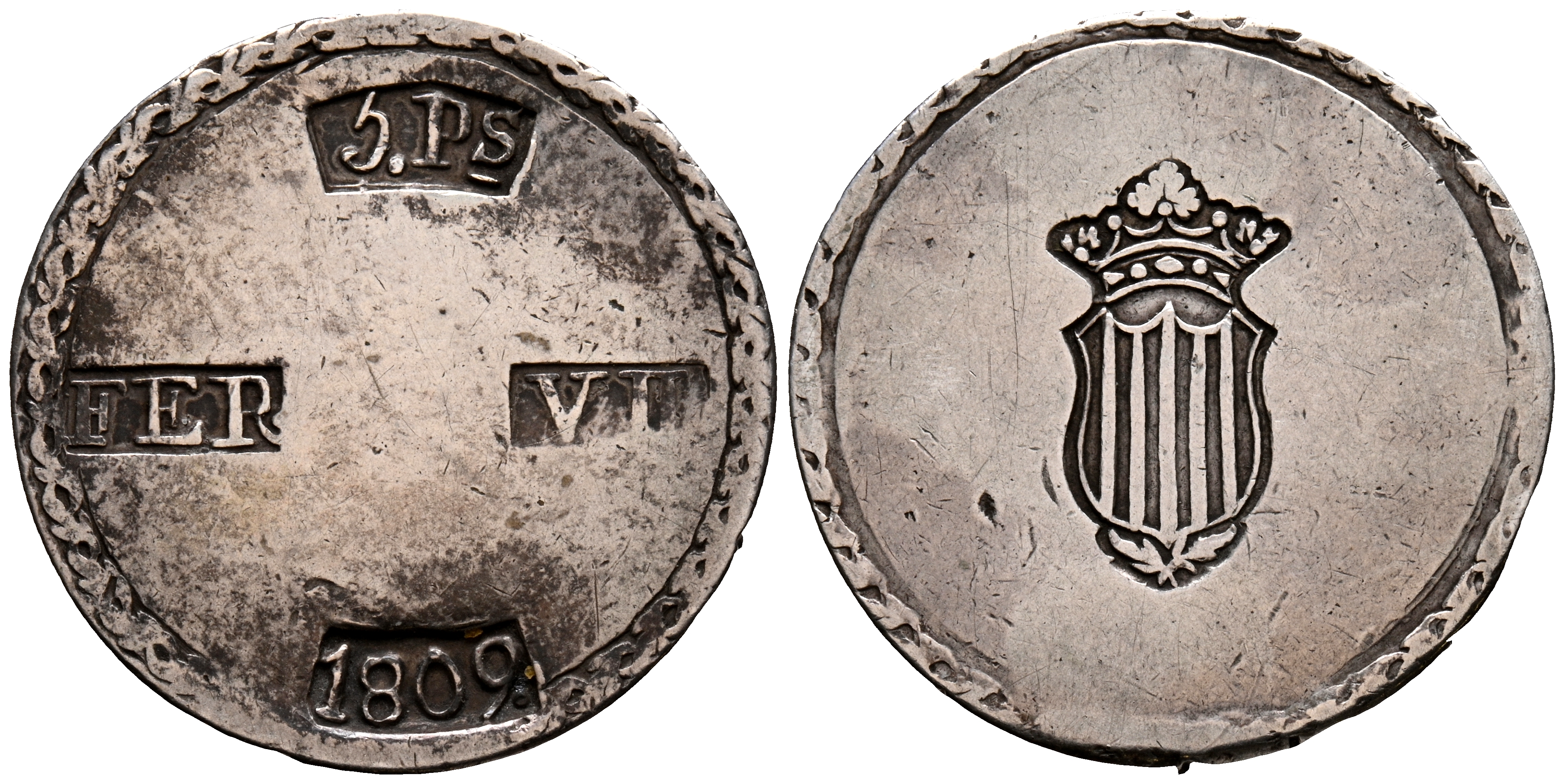 FERNANDO VII (1808-1833). 5 Pesetas. (Ar. 26,40g/39mm). 1809. Tarragona. (Cal-2019-1429). MBC-.