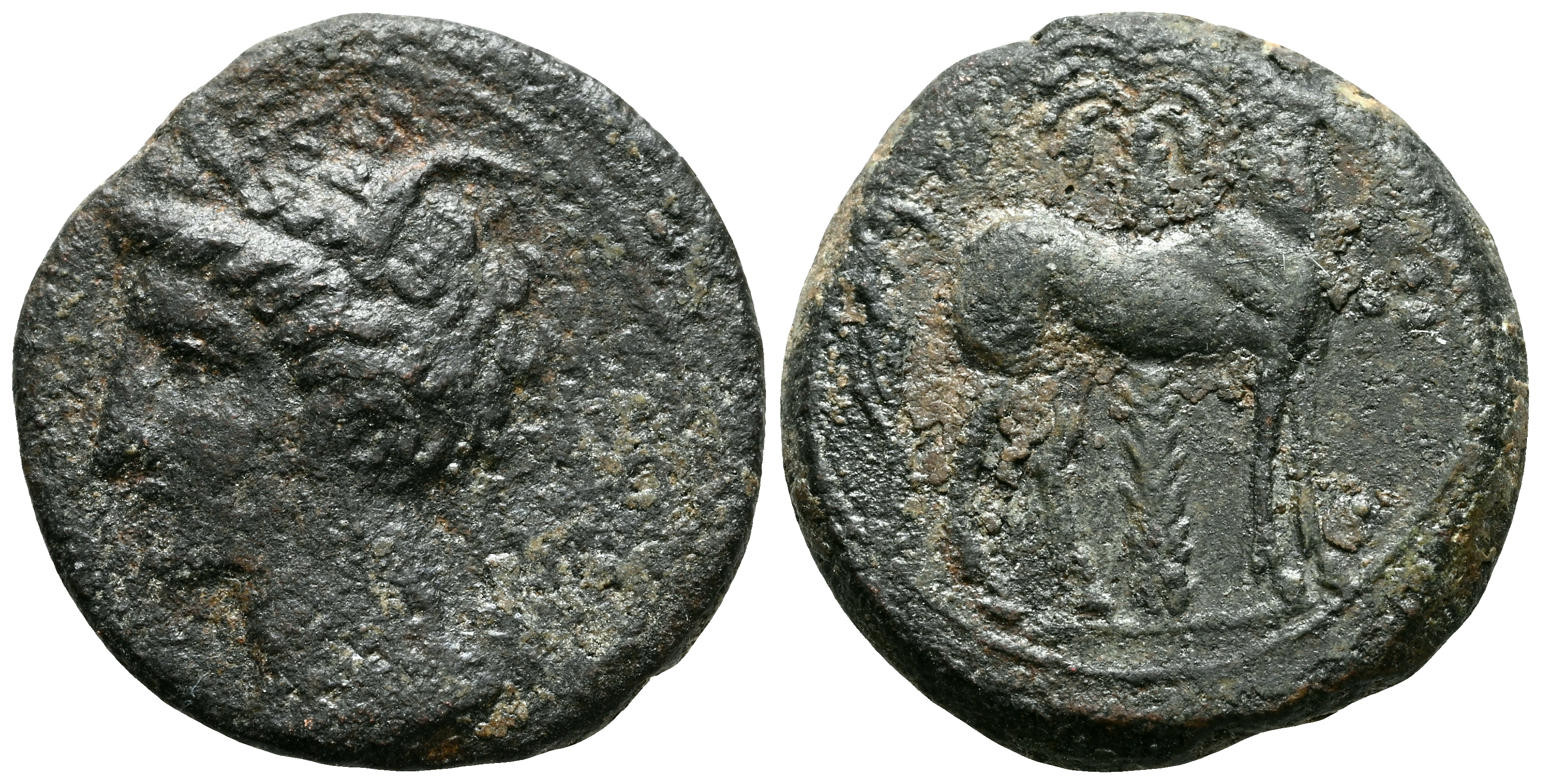 CARTAGONOVA (Cartagena, Murcia). 1/2 Calco. (Ae. 2,88g/16mm). 220-215 a.C. (FAB-507). Anv: Cabeza de Tanit a izquierda. Rev: Caballo parado a derecha, detrás palmera. MBC.