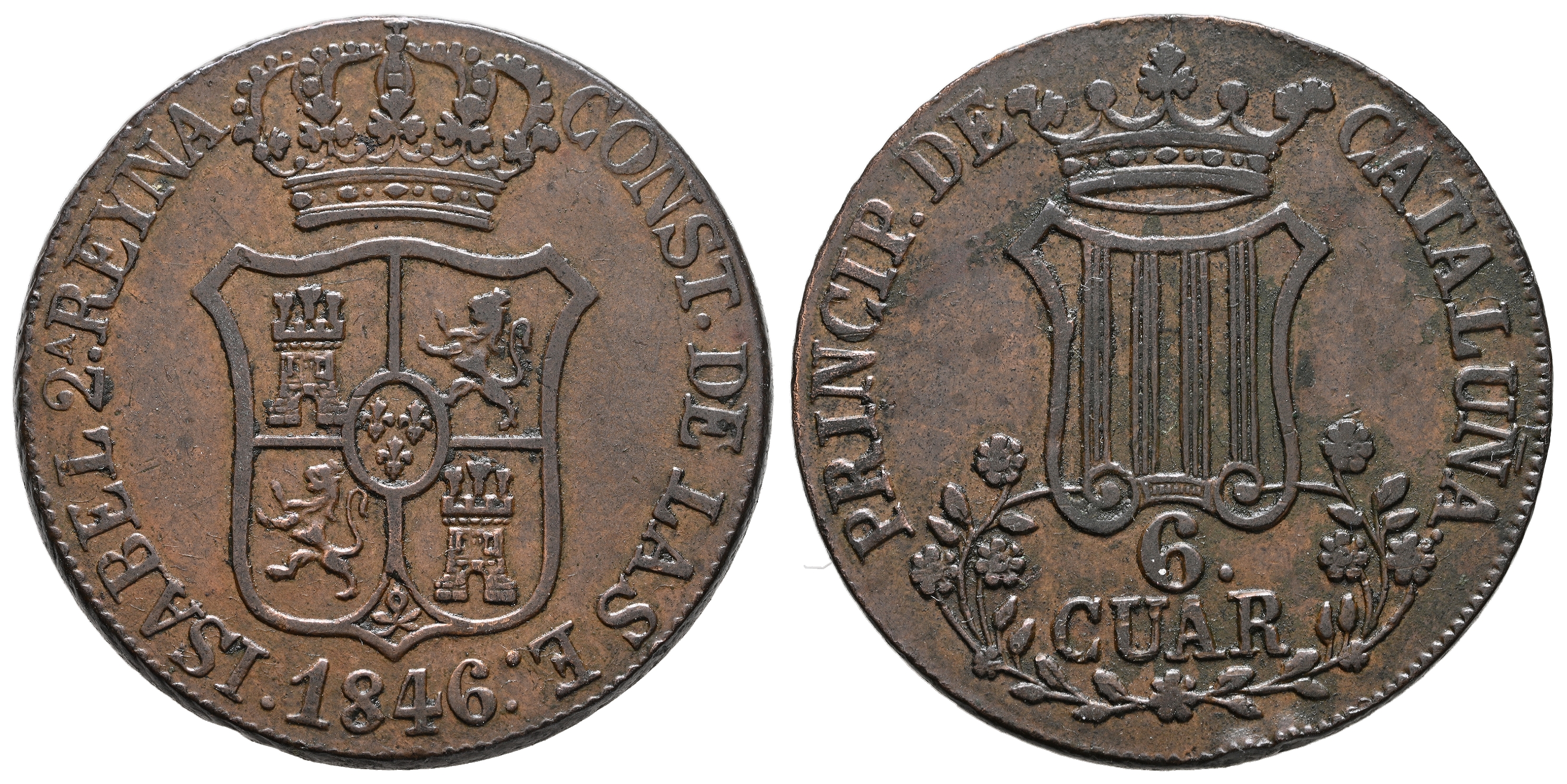 ISABEL II (1833-1868). 6 Cuartos. (Ae. 13,93g/33mm). 1846. Barcelona. (Cal-2019-31). Flor de 7 pétalos. MBC+.