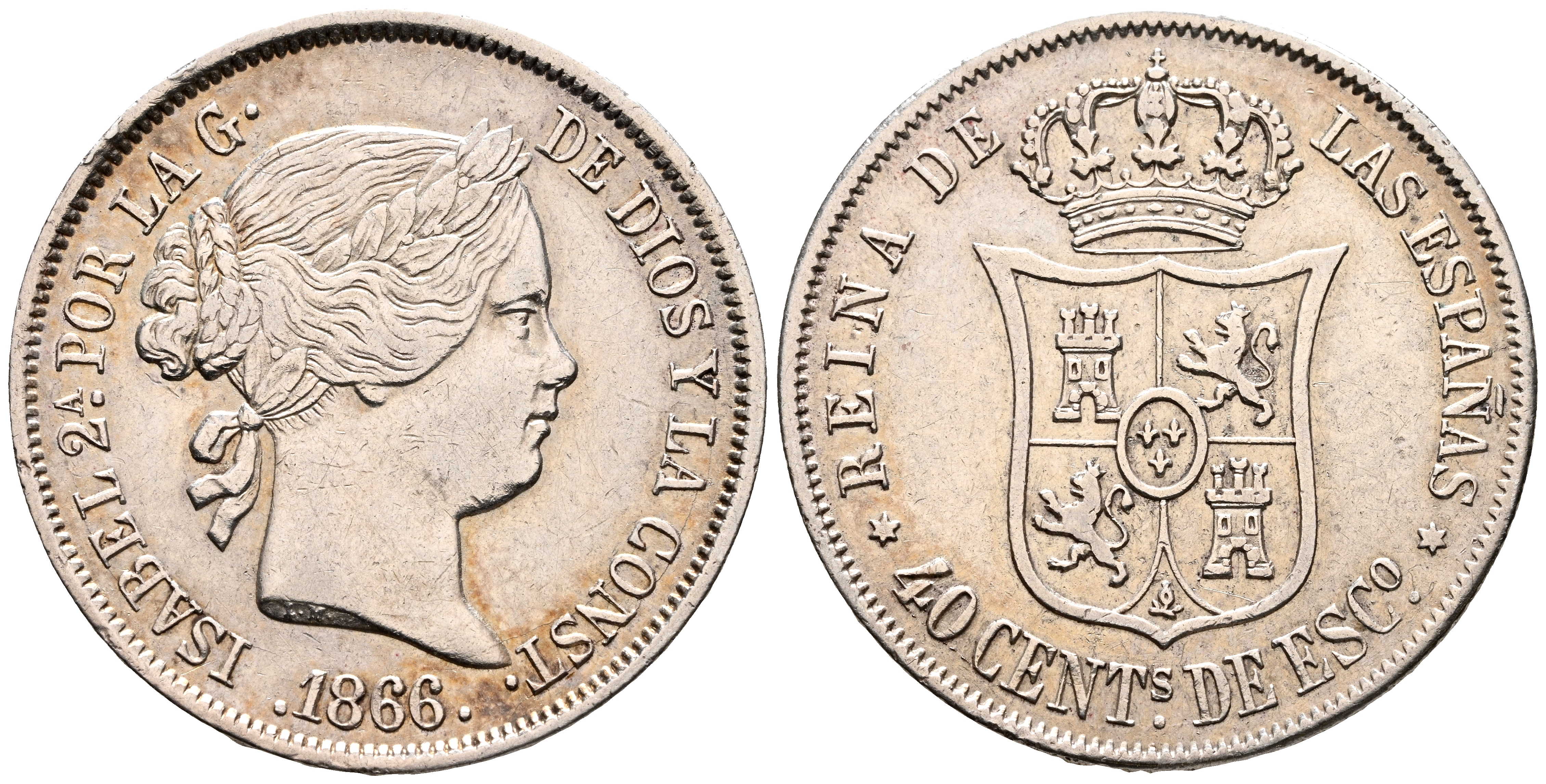 ISABEL II (1833-1868). 40 Céntimos de Escudo. (Ar. 5,14g/23mm). 1866. Madrid. (Cal-2019-501). MBC+.