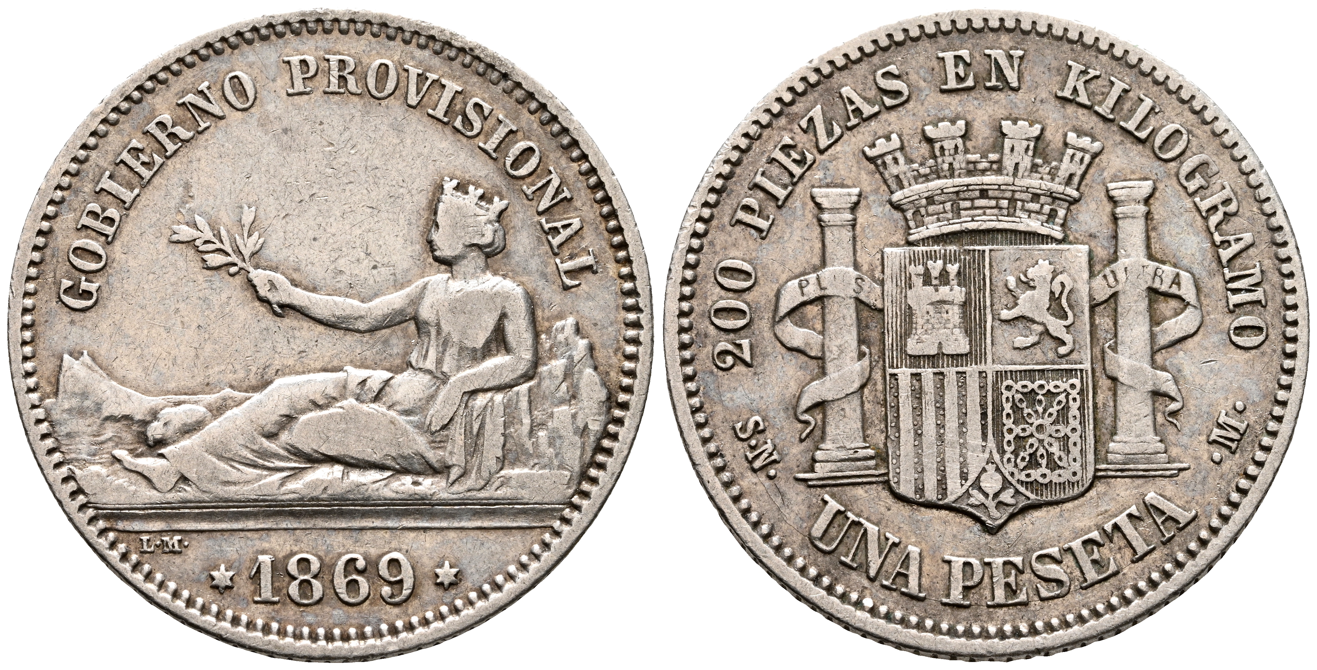 GOBIERNO PROVISIONAL (1868-1871). 1 Peseta. (Ar. 4,93g/23mm). 1869. Madrid SNM. (Cal-2019-16). Leyenda: Gobierno Provisional. MBC.