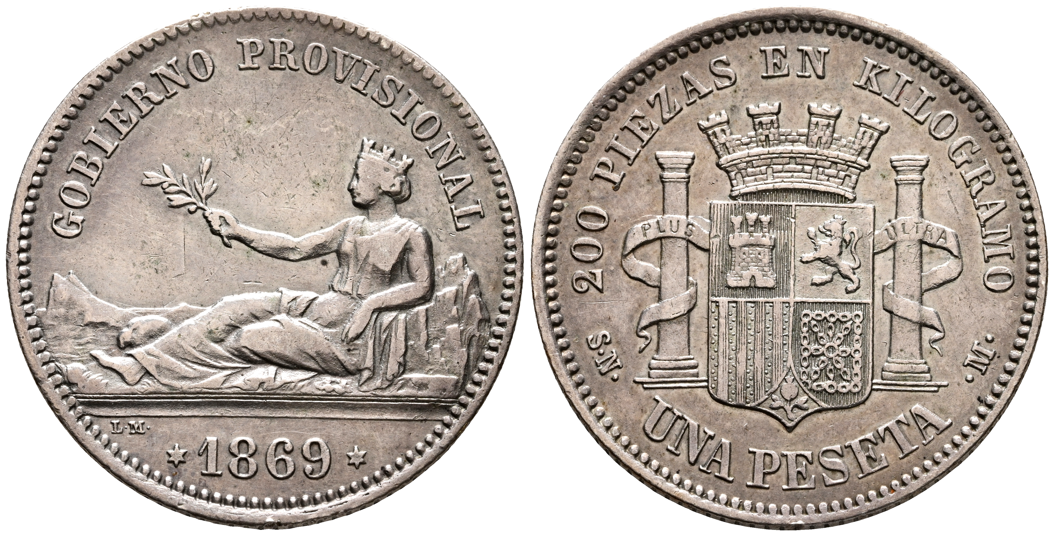 GOBIERNO PROVISIONAL (1868-1871). 1 Peseta. (Ar. 4,90g/23mm). 1869. Madrid SNM. (Cal-2019-16). Leyenda: Gobierno Provisional. MBC+. Buen ejemplar. Escaso así.