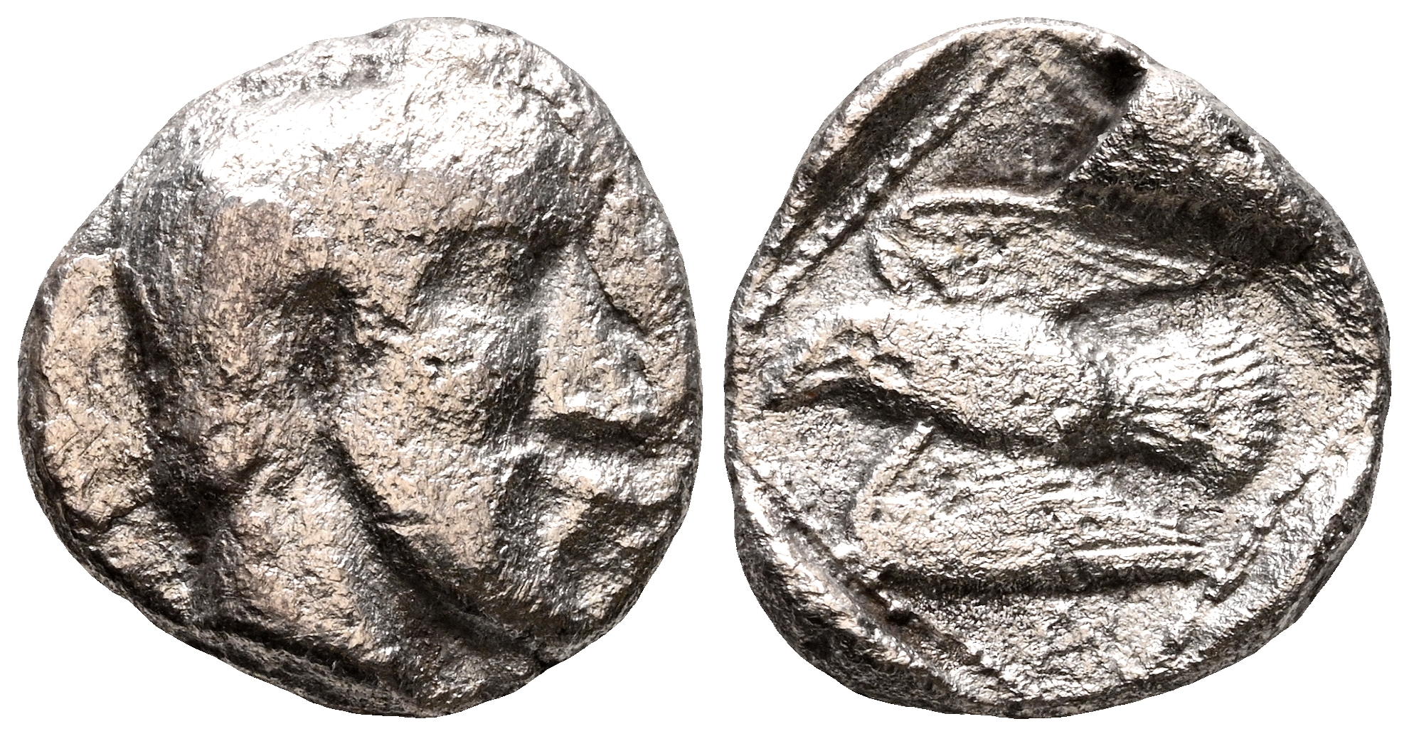 JONIA, Magnesia ad Maeandrum. ¿Trihemióbolo? (Ar. 0,89g/10mm). Posterior a 459 a.C. Arqueópolis. (Nollé & Wenninger 2a var). Anv: Cabeza masculina barbada a derecha. Rev: Águila volando a izquierda, en campo monograma: AP, todo dentro de cuadrado incuso. MBC. Limpieza agresiva. Muy raro ejemplar. Ex Leu Numismatik, Web Auction 38 (13/12/2025), Nº Lote 699.