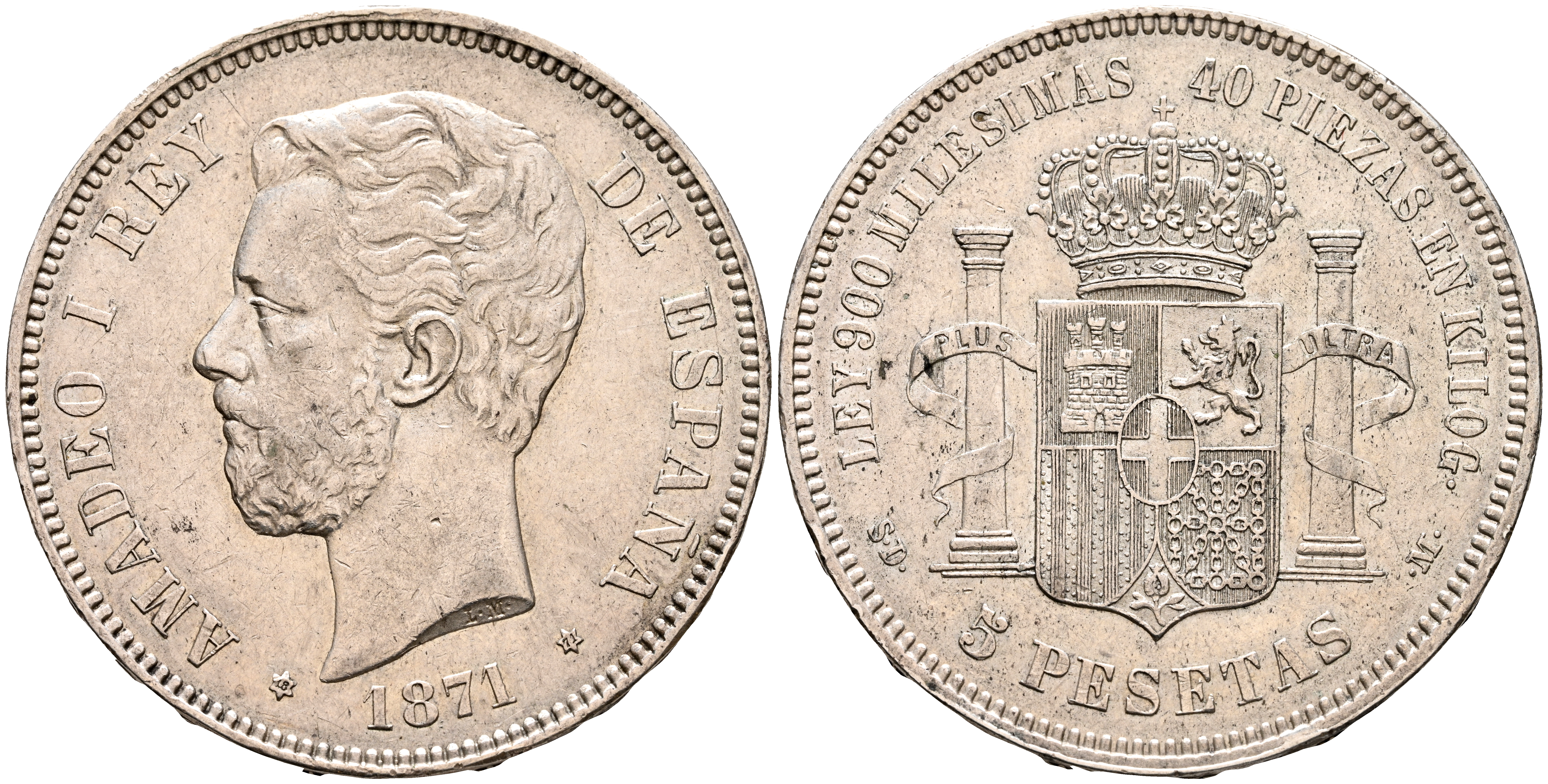 AMADEO I (1871-1873). 5 Pesetas. (Ar. 25,01g/37mm). 1871 *18-71. Madrid SDM. (Cal-2019-1). MBC+.