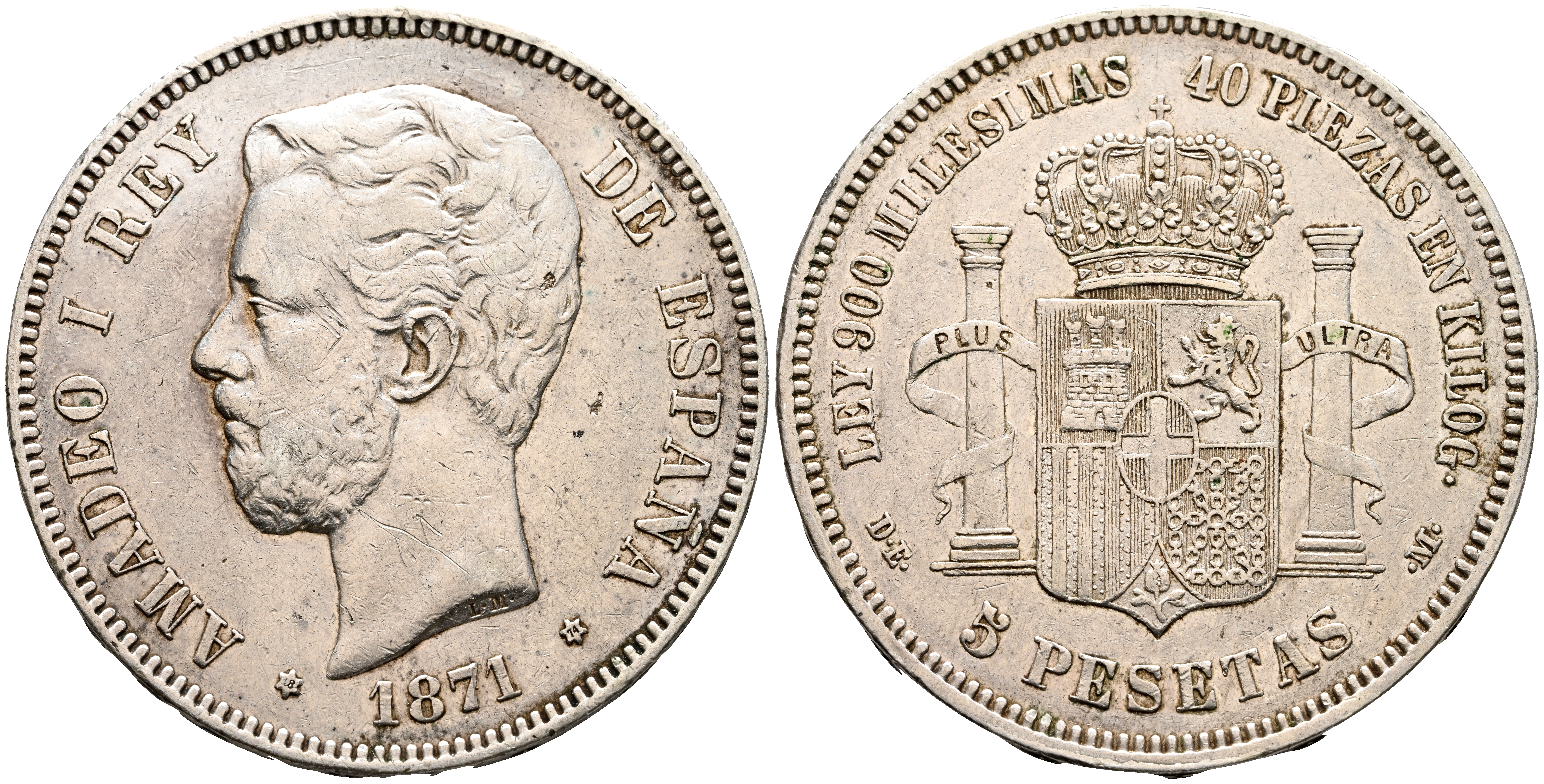 AMADEO I (1871-1873). 5 Pesetas. (Ar. 24,84g/38mm). 1871 *18-74. Madrid DEM. (Cal-2019-5). MBC.