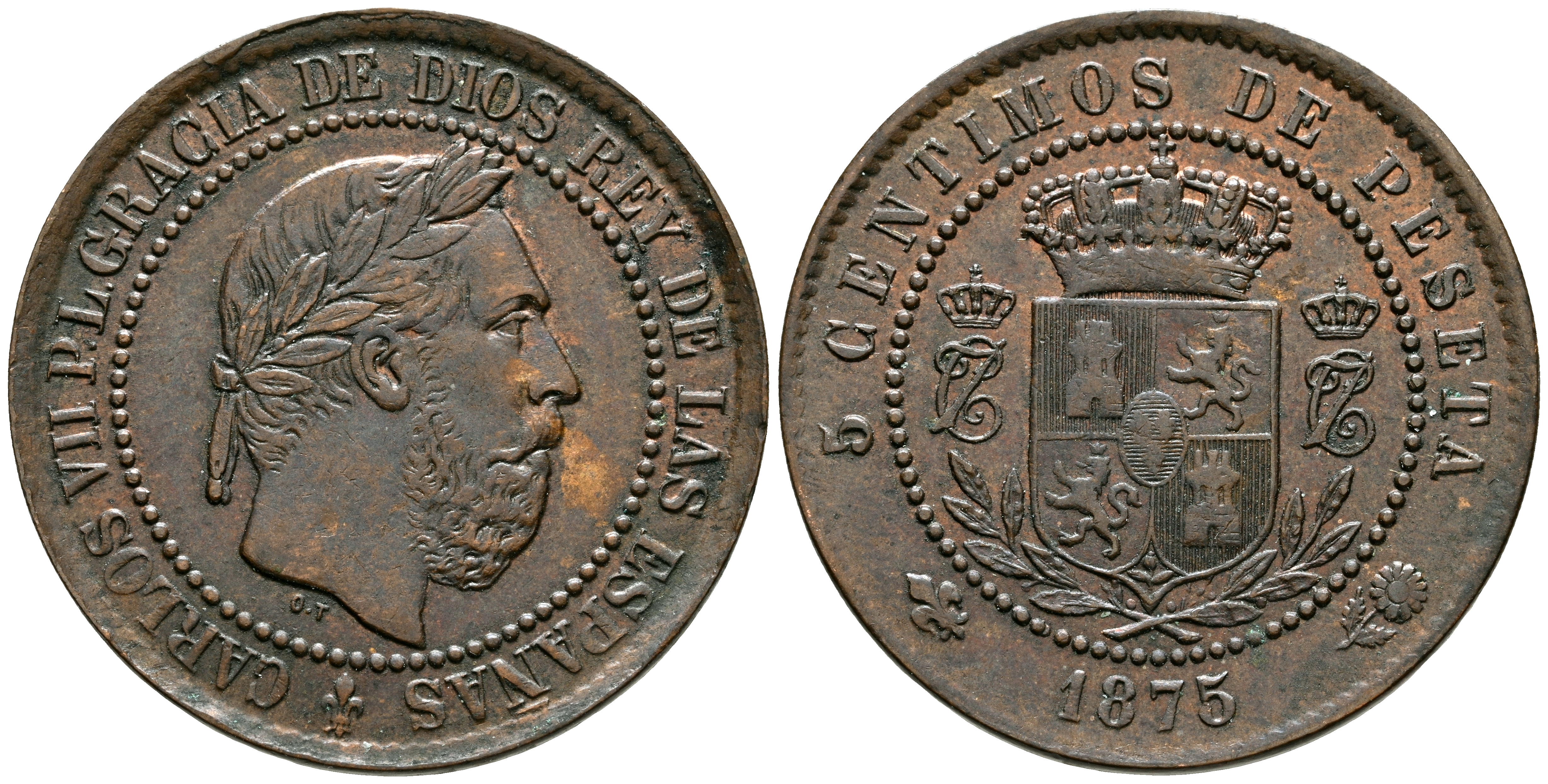 CARLOS VII (1868-1909). 5 Céntimos. (Ae. 5,12g/25mm). 1875. Oñate. (Cal-2019-2). MBC+. Reverso coincidente. Bonito tono.