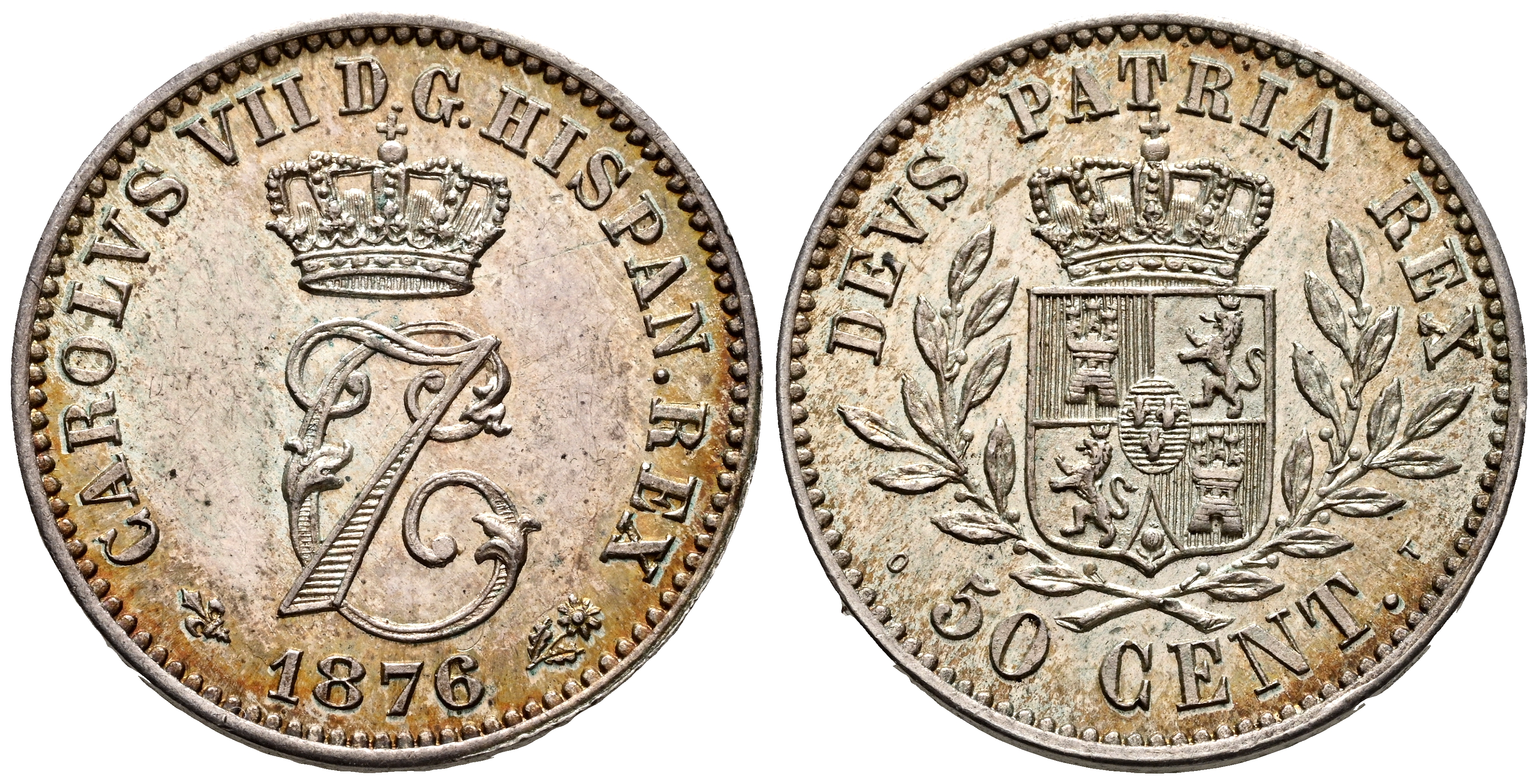 CARLOS VII (1868-1909). 50 Céntimos. (Ar. 2,54g/18mm). 1876. Bruselas. (Cal-2019-9). EBC. Bonita pátina.