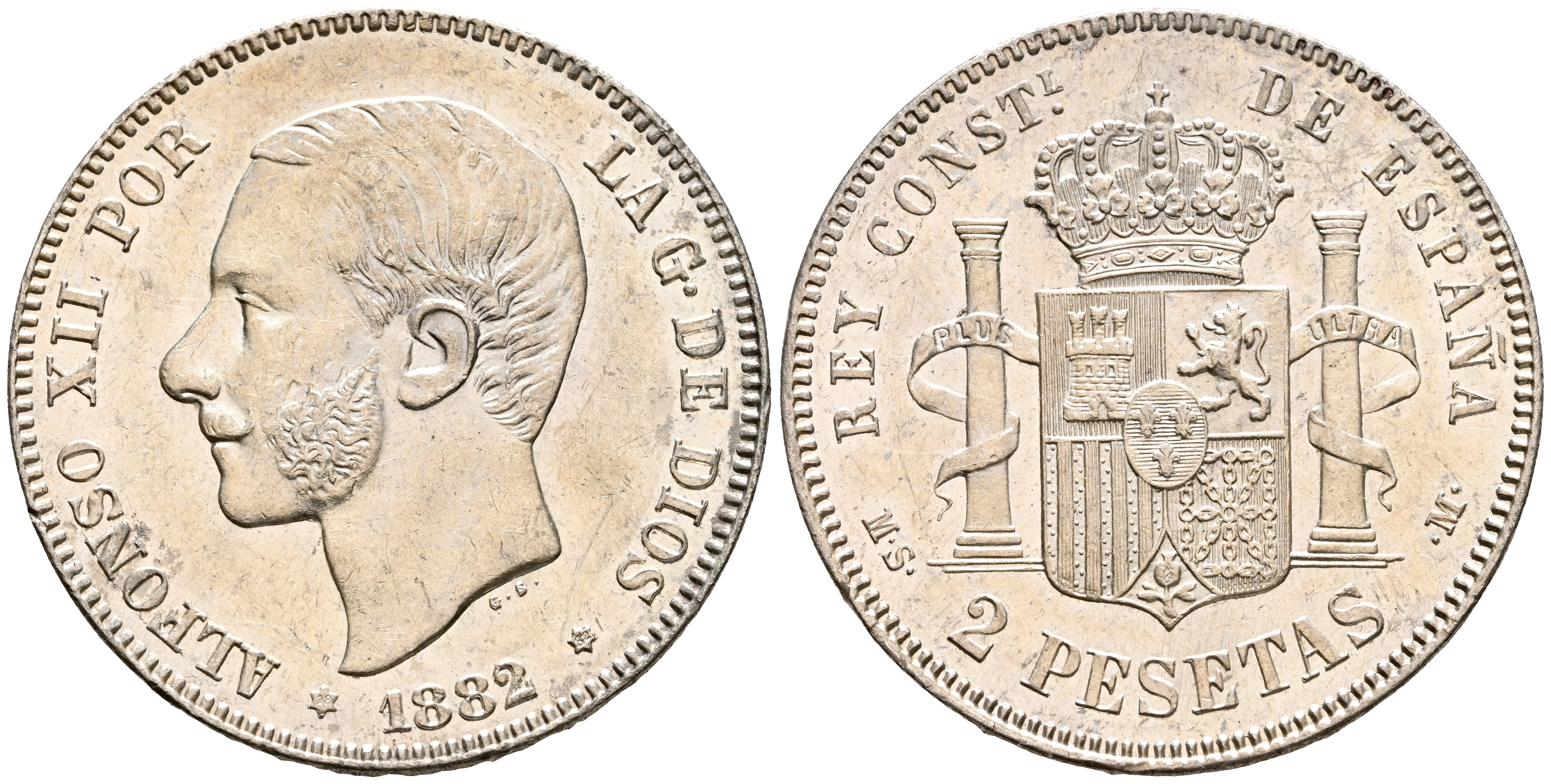 ALFONSO XII (1874-1885). 2 Pesetas. (Ar. 9,98g/27mm). 1882 *18-82. Madrid MSM. (Cal-2019-32). EBC+. Brillo original. Ligeras marquitas. Escasa en esta calidad.