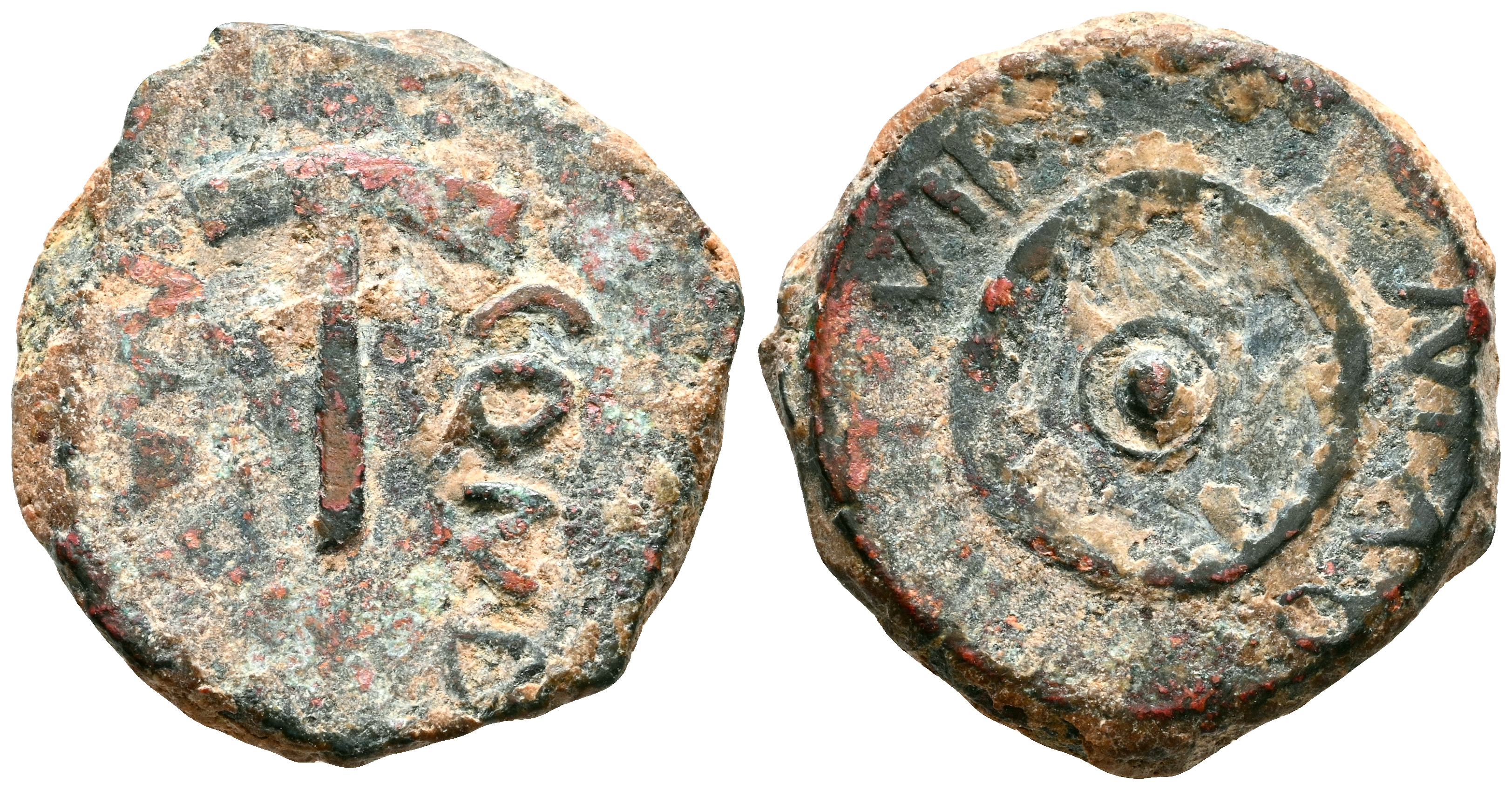 CARTAGONOVA (Cartagen, Murcia). Cuadrante. (Ae. 3,39g/16mm). 50-30 a.C. (FAB-574). Anv: Martillo, alrededor leyenda: CONDV MALL. Rev: Rodela, alrededor leyenda: II VIR QVINQ. MBC. Escaso ejemplar.