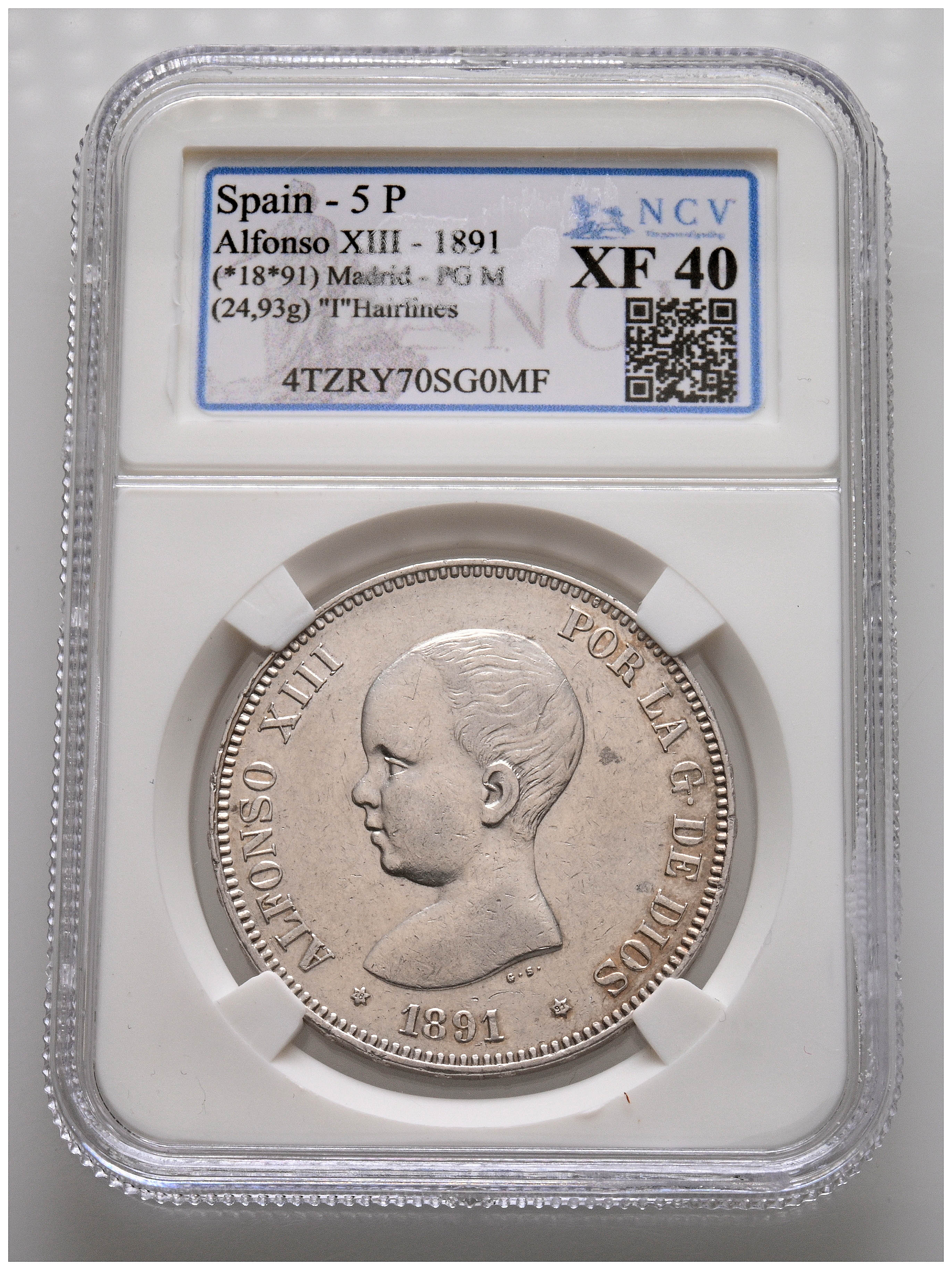 ALFONSO XIII (1885-1931). 5 Pesetas. (Ar. 24,93g/37mm). 1891 *18-91. Madrid PGM. (Cal-2019-98). Encapsulado por NCV XF 40.