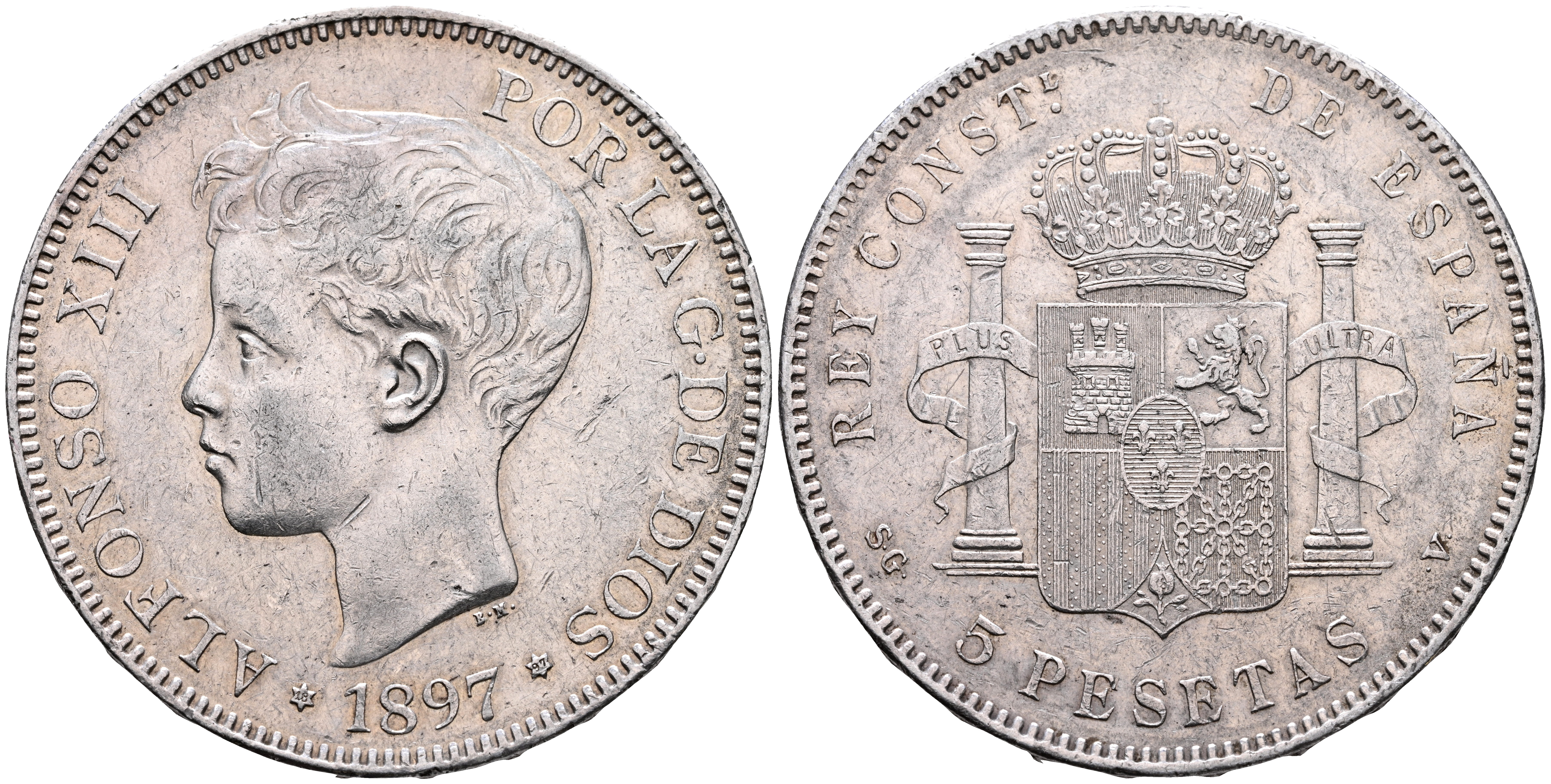 ALFONSO XIII (1885-1931). 5 Pesetas. (Ar. 24,89g/37mm). 1897 *18-97. Madrid SGV. (Cal-2019-107). MBC+.