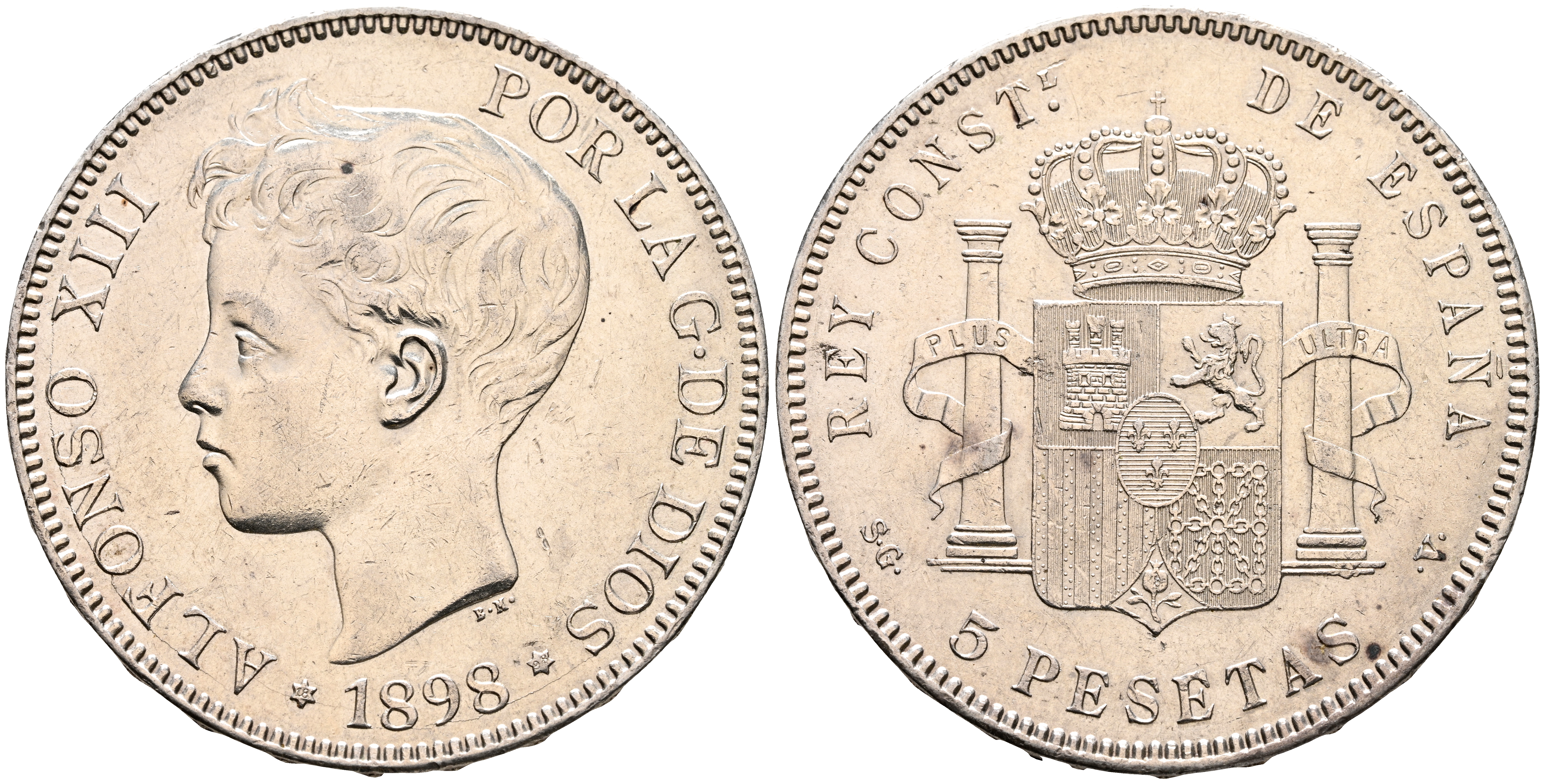 ALFONSO XIII (1885-1931). 5 Pesetas. (Ar. 24,65g/37mm). 1898 *18-98. Madrid SGV. (Cal-2019-109). EBC. Brillo original. Leves rayitas.