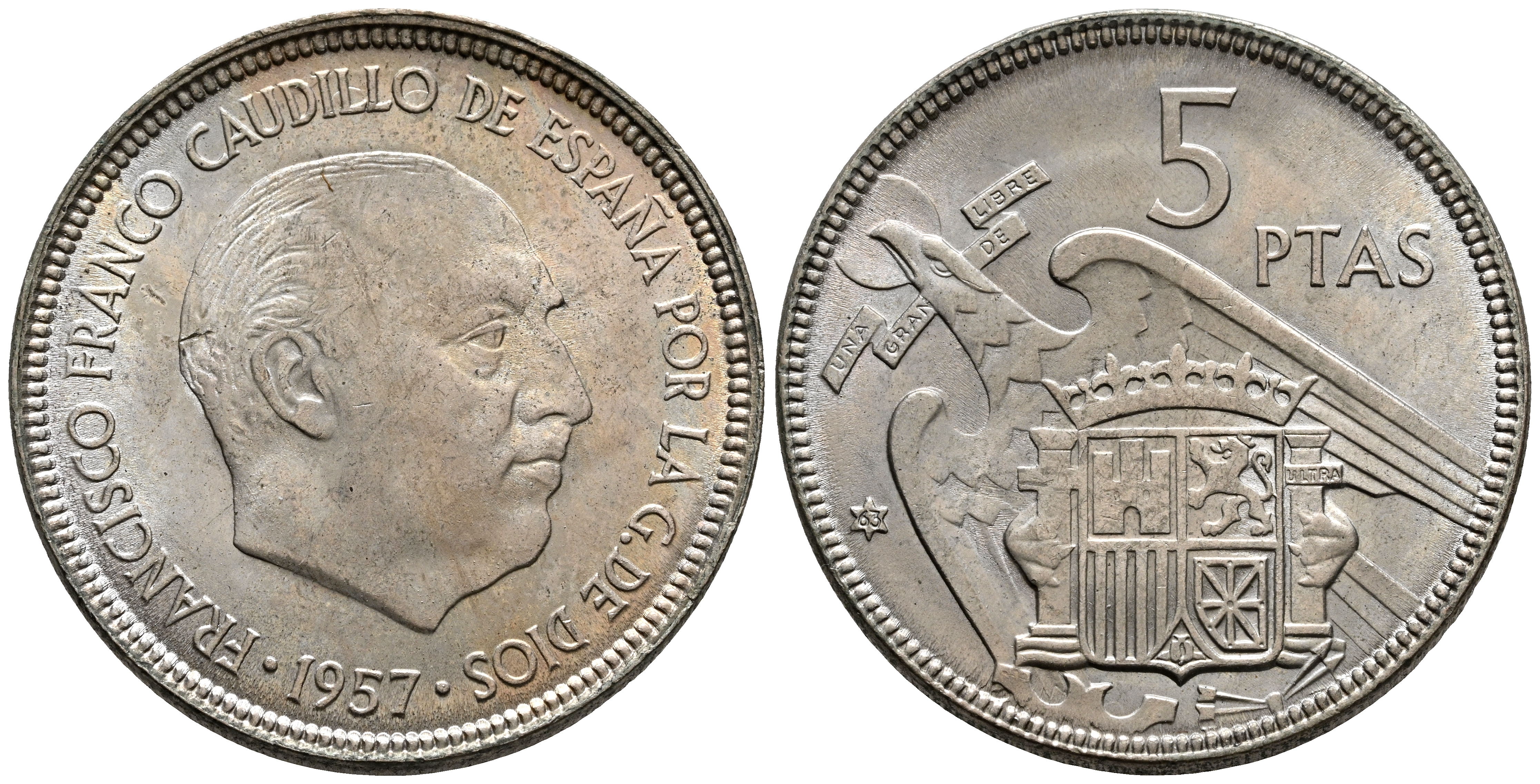 ESTADO ESPAÑOL (1936-1975). 5 Pesetas. (Ni. 5,72g/23mm). 1957 *63. Madrid. (Cal-2019-103). SC-/SC. Preciosa pátina.