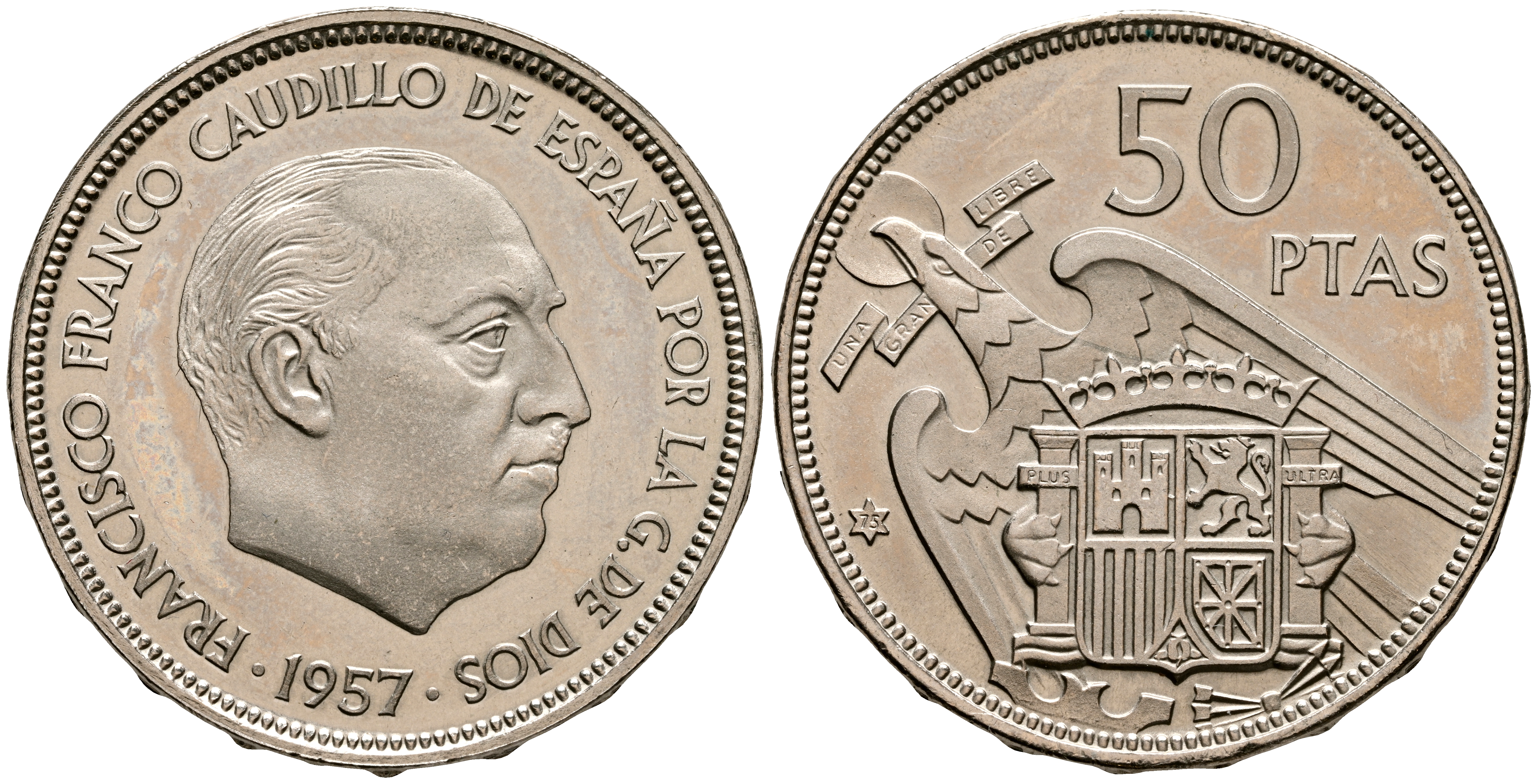 ESTADO ESPAÑOL (1936-1975). 50 Pesetas. (Ni. 12,54g/30mm). 1957 *75. Madrid. (Cal-2019-144). SC. Brillo espejo.