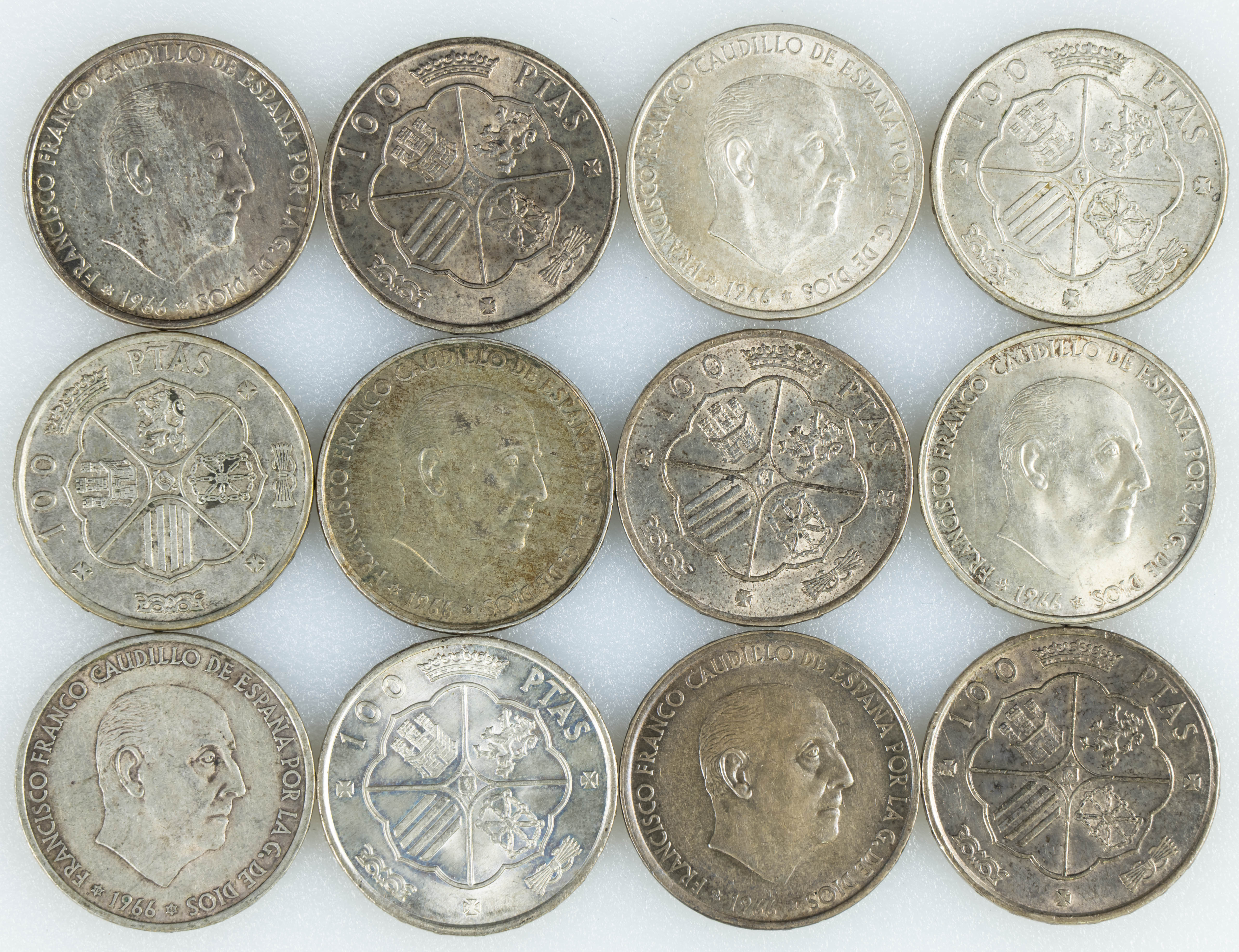 ESTADO ESPAÑOL (1936-1975). Conjunto de 12 monedas de 100 Pesetas en plata de 1966 (*66, *67 y *68). Diferentes estados de conservación. A EXAMINAR.