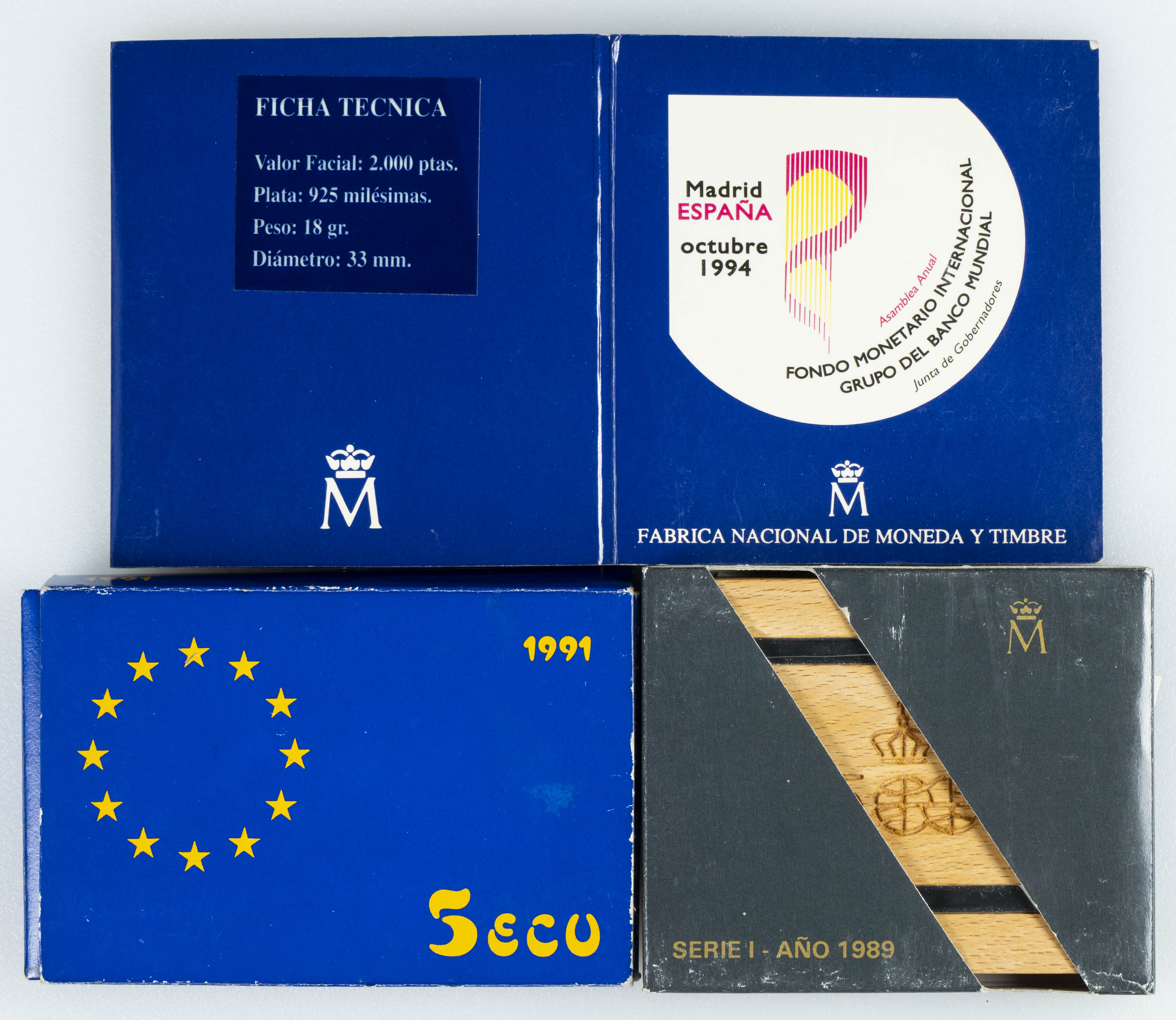 JUAN CARLOS I (1975-2014). Conjunto de 3 estuches/set con valores de 2000 Pesetas, 5000 Pesetas y 5 Ecus. Terminaciones PROOF y FDC. A EXMINAR.