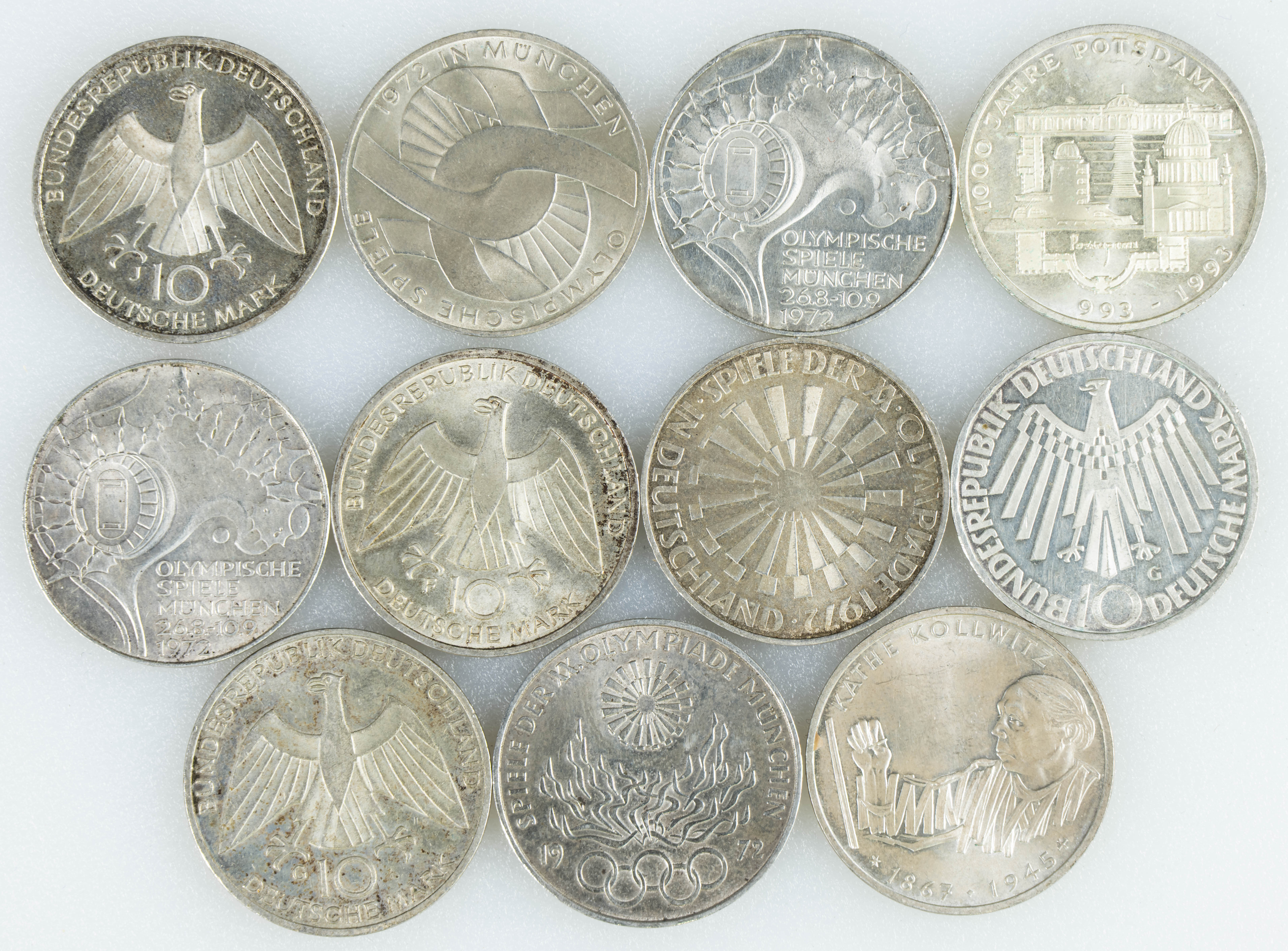 ALEMANIA. Conjunto de 11 monedas de plata de 10 Mark conmemorativos, todas diferentes, con variedad de cecas y temáticas. Diferentes estados de conservación. A EXAMINAR.