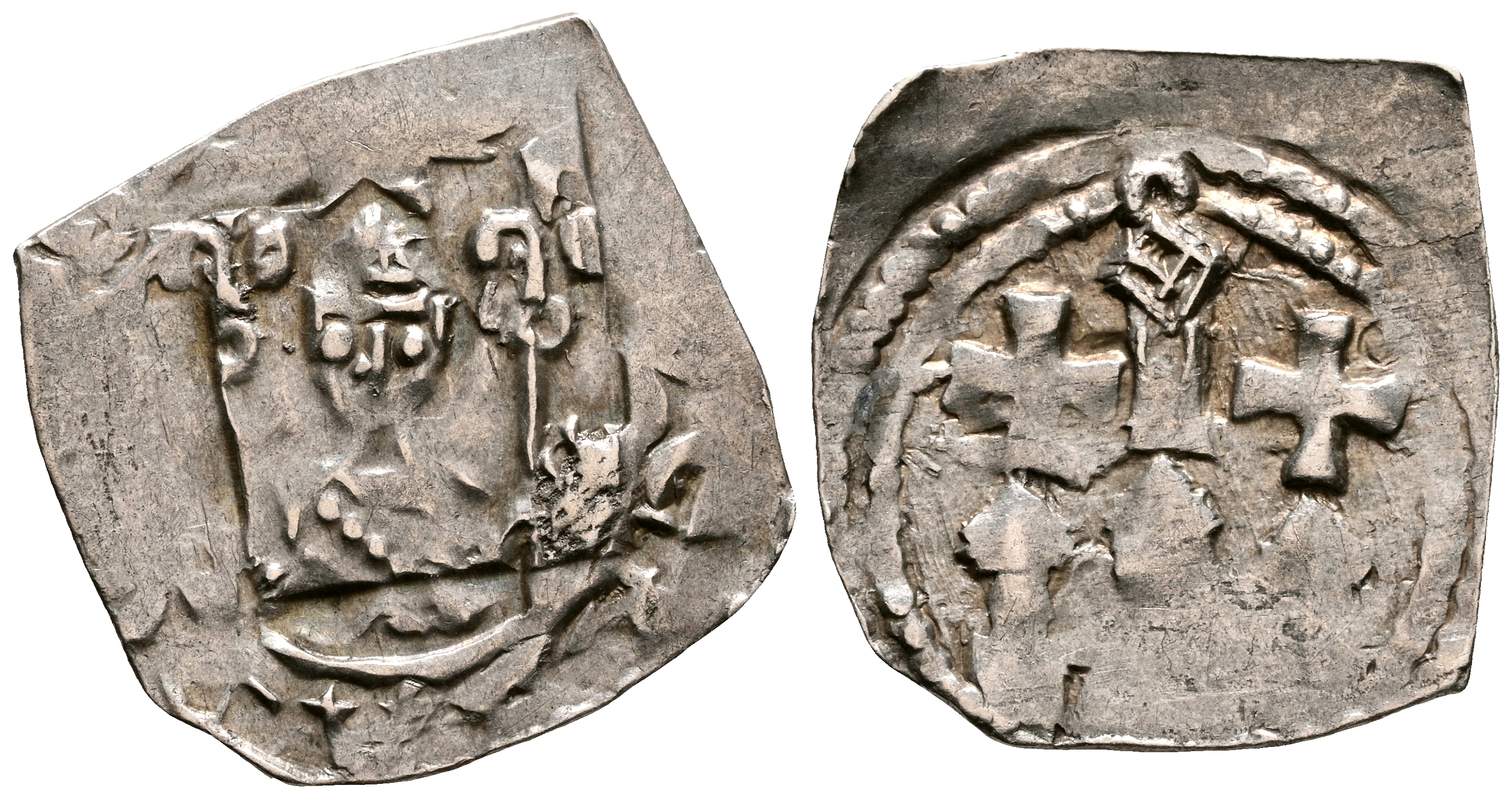 AUSTRIA, Eberhard II (1200-1246). Pfennig. (Ar. 0,71g/14mm). Arzobispado de Salzburgo, Pettau. (CNA Cg1). Anv: Busto de obispo de frente, sosteniendo un lirio en cada mano, encima, estrella de seis puntas. Rev: Busto de obispo de frente entre dos torres, arriba, torreón entre dos cruces. MBC.
