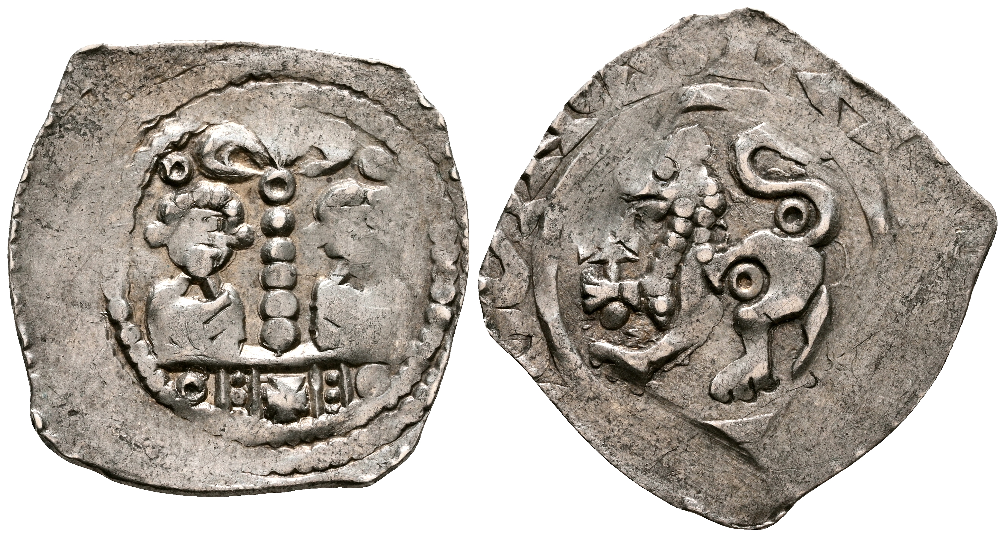 AUSTRIA, Bernhard II (1202-1256). Pfennig. (Ar. 0,99g/18mm). Ducado de Carintia, Landstrass. (CNA Cn4). Anv: Dos bustos sobre altar separados por una palmera. Rev: león a la izquierda sosteniendo una cruz. MBC.