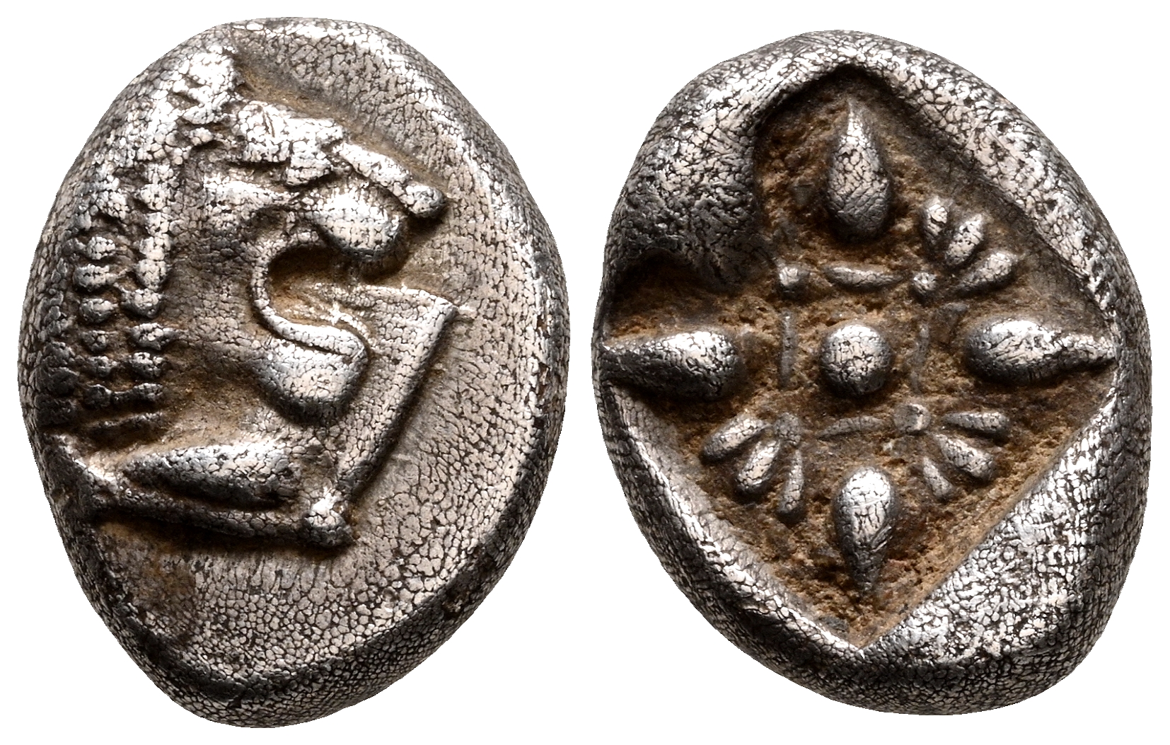 JONIA, Miletos. Dióbolo. (Ar. 1,13g/10mm). 600-500 a.C. (SNG Von Aulock 2080). Anv: Cabeza de leon a derecha. Rev: Diseño estrellado incuso. MBC.
