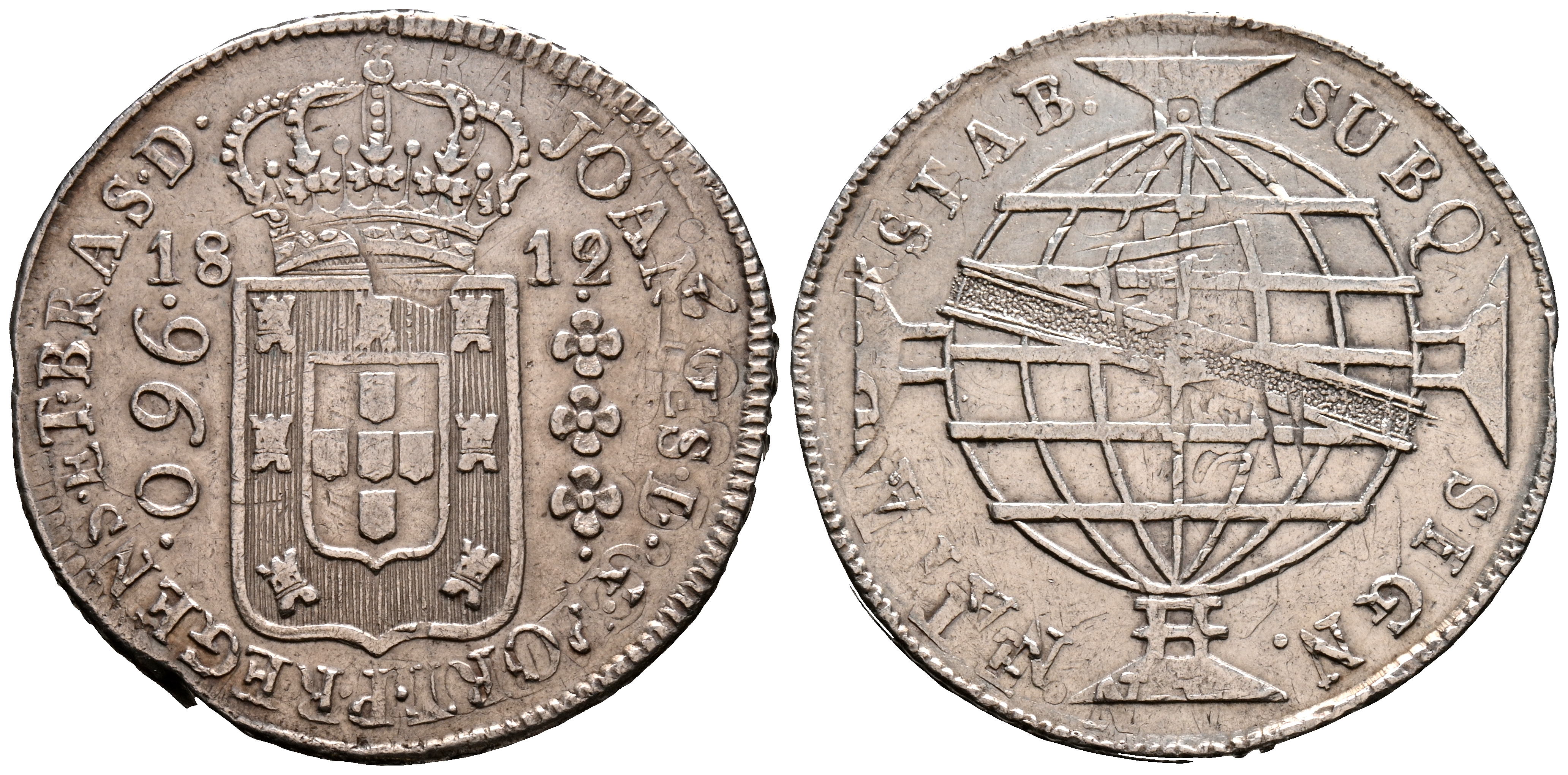 BRASIL (Portugués), Juan, príncipe regente. 960 Reis. (Ar. 26,83g/ 41mm). 1812. Bahía B. (Km#307.1). Acuñada sobre una pieza de 8 Reales españoles (Carlos IV). MBC+.