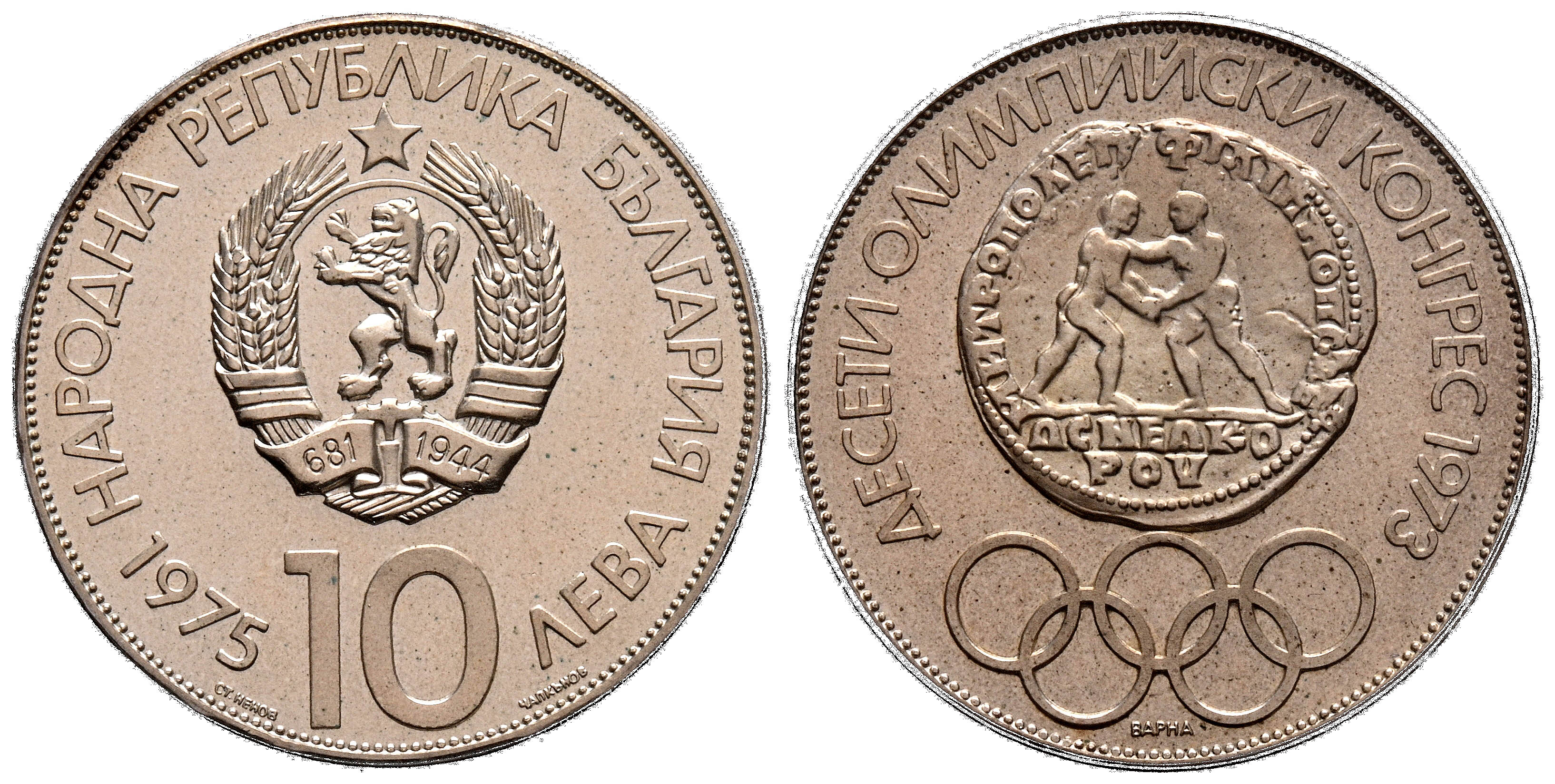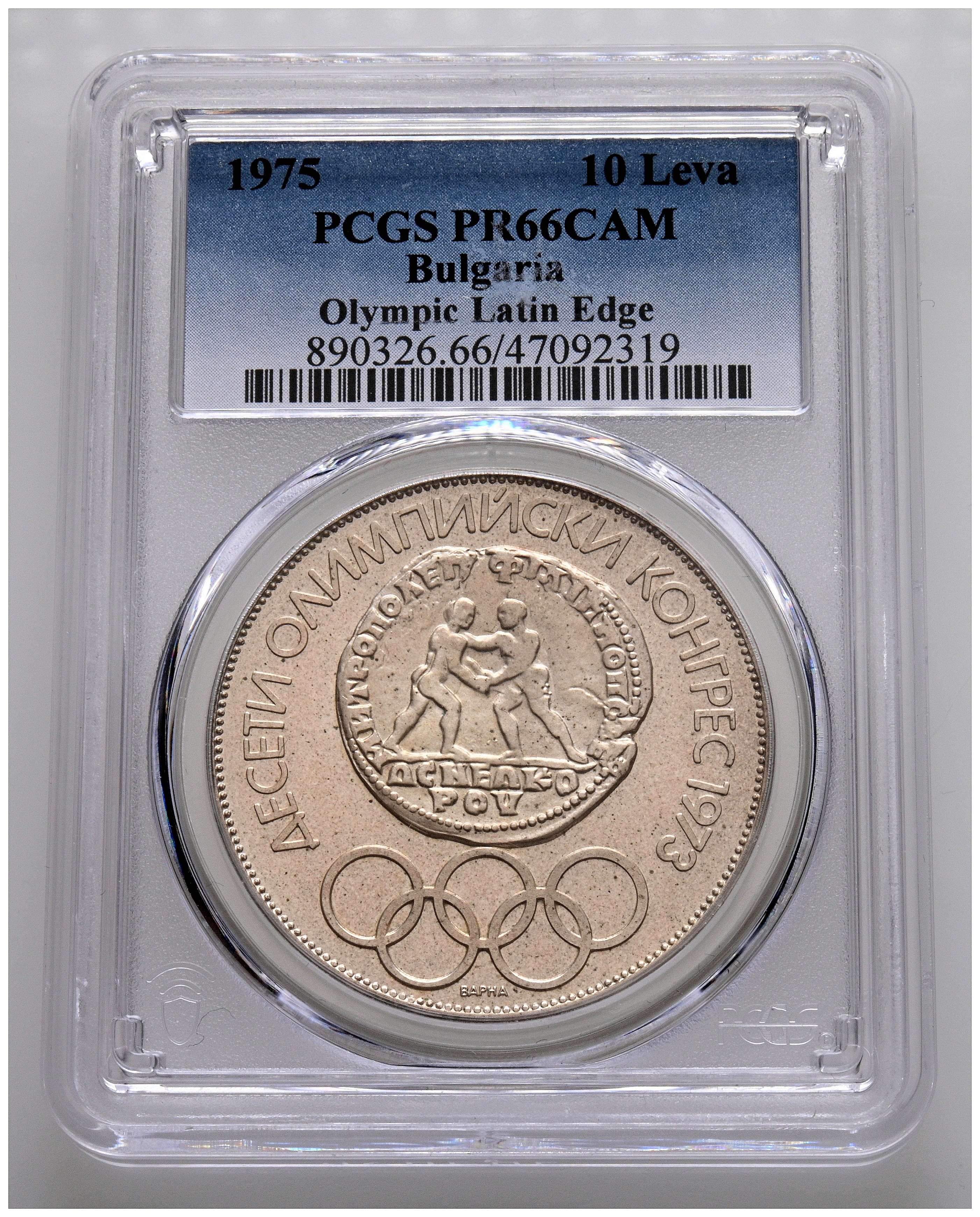BULGARIA. 10 Leva. (Ar. 30,00g/40mm)*. 1975. X Congreso Olímpico. (Km#93). Encapsulada por PCGS PR 66CAM. *Peso y medidas teóricos.