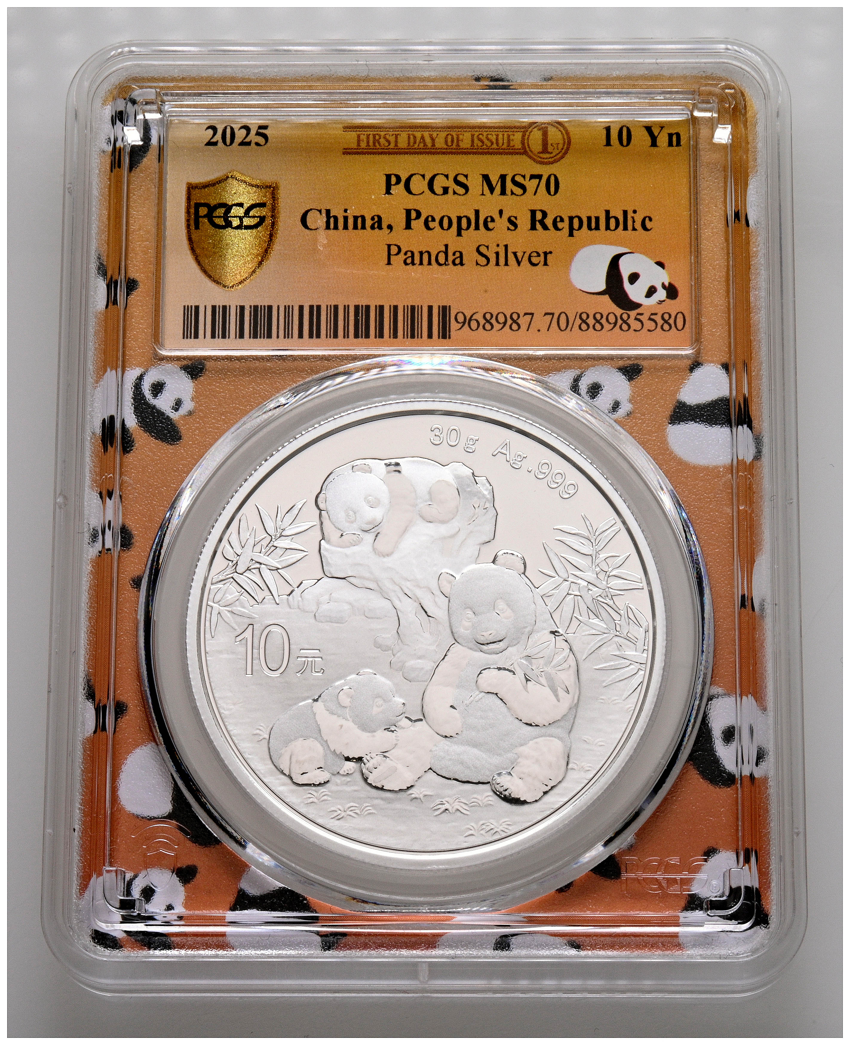 CHINA. 10 Yuan. (Ar. 30,00g/40mm)*. 2025. Serie Panda. First Day of Issue. Encapsulado por PCGS MS 70. *Peso y medidas teóricos.