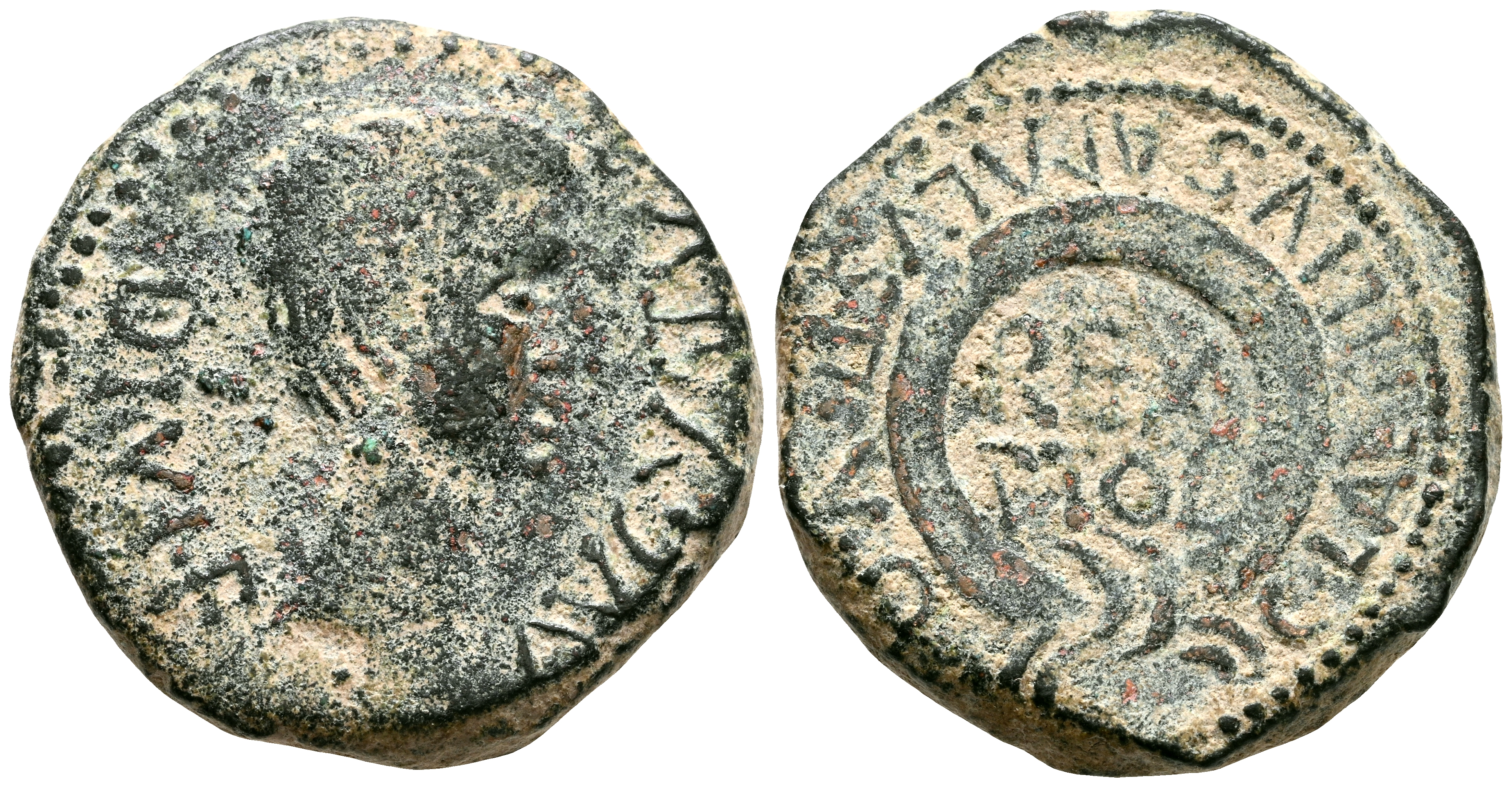 CARTAGONOVA (Cartagena, Murcia). Semis. (Ae. 5,69g/20mm). 27 a.C.-14 d.C. (FAB-590). Anv: Cabeza de Augusto a derecha, alrededor leyenda: AVGVSTVS DIVI F. Rev: Leyenda: REX/PTOL, dentro de láurea, alrededor leyenda: C LAETILIVS APALVS II V Q. MBC.