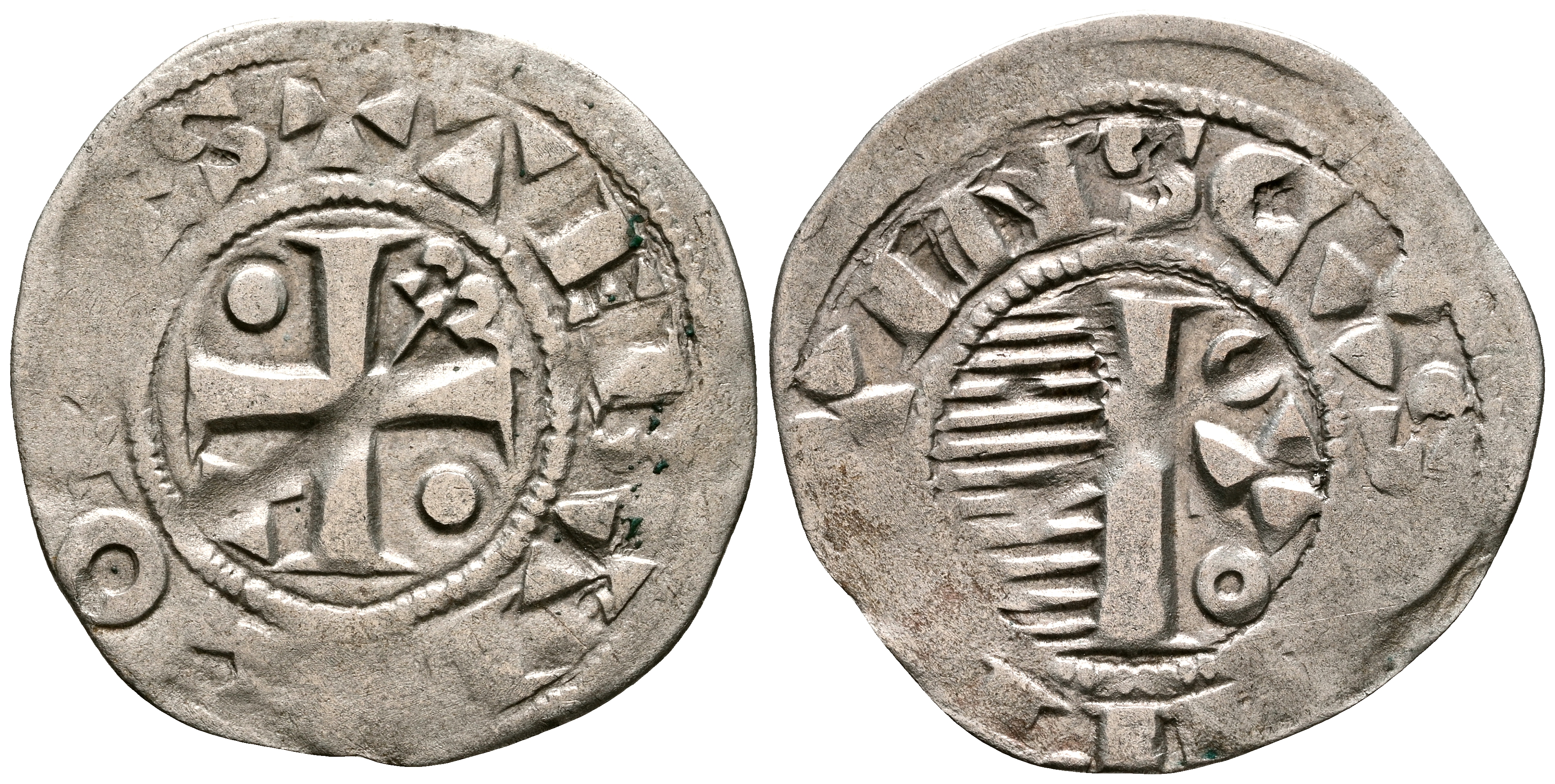 FRANCIA, Teobaldo II (1125-1152). Dinero. (Ar. 1,01g/20mm). Ciudad de Provins (Provincia de Sens). (Metcalf 23, 588 s; Poey d'Avant 5971). Anv: Cruz patada, punto en 1º y 4º cuadrante, M y A en 2º y 3º, todo dentro de una gráfila circular, alrededor leyenda: TEBALT COMES. Rev: Y entre dos criculos sobre cresta, todo dentro de gráfila circular, alrededor leyenda: CASTRI PRVVINS. MBC.