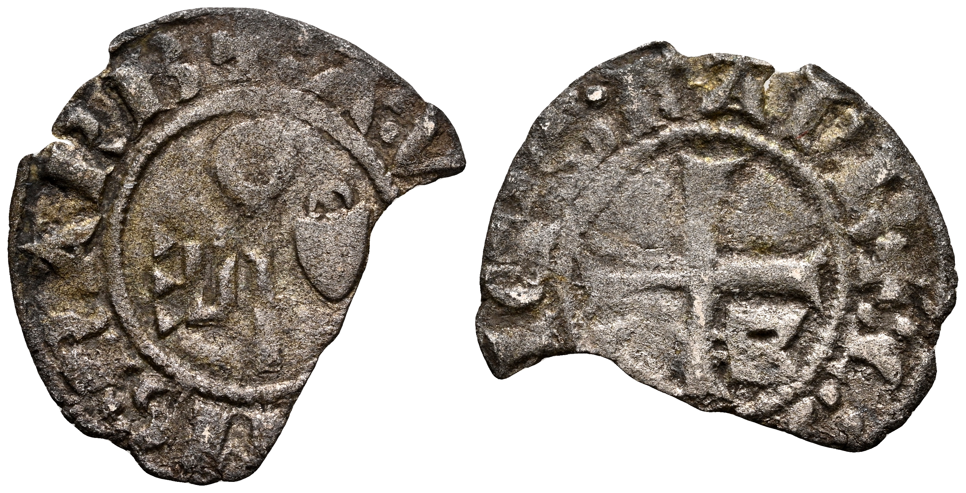 FRANCIA. Aimeri VI, con el arzobispo Gilles Aycelin. Dinero. (Ve. 0,47g/16mm). 1306-1318. Vizcondado de la Narnona. (Duplessy, Féodales 1550). Anv: Llave y escudo detro de gráfila circular, alrededor leyenda: A VICE COMS NARB. Rev: Cruz patada con mitra en el 2º cuartel, alrededor leyenda: ARCHIERS NARB. MBC-. Cospel faltado. Muy raro ejemplar.