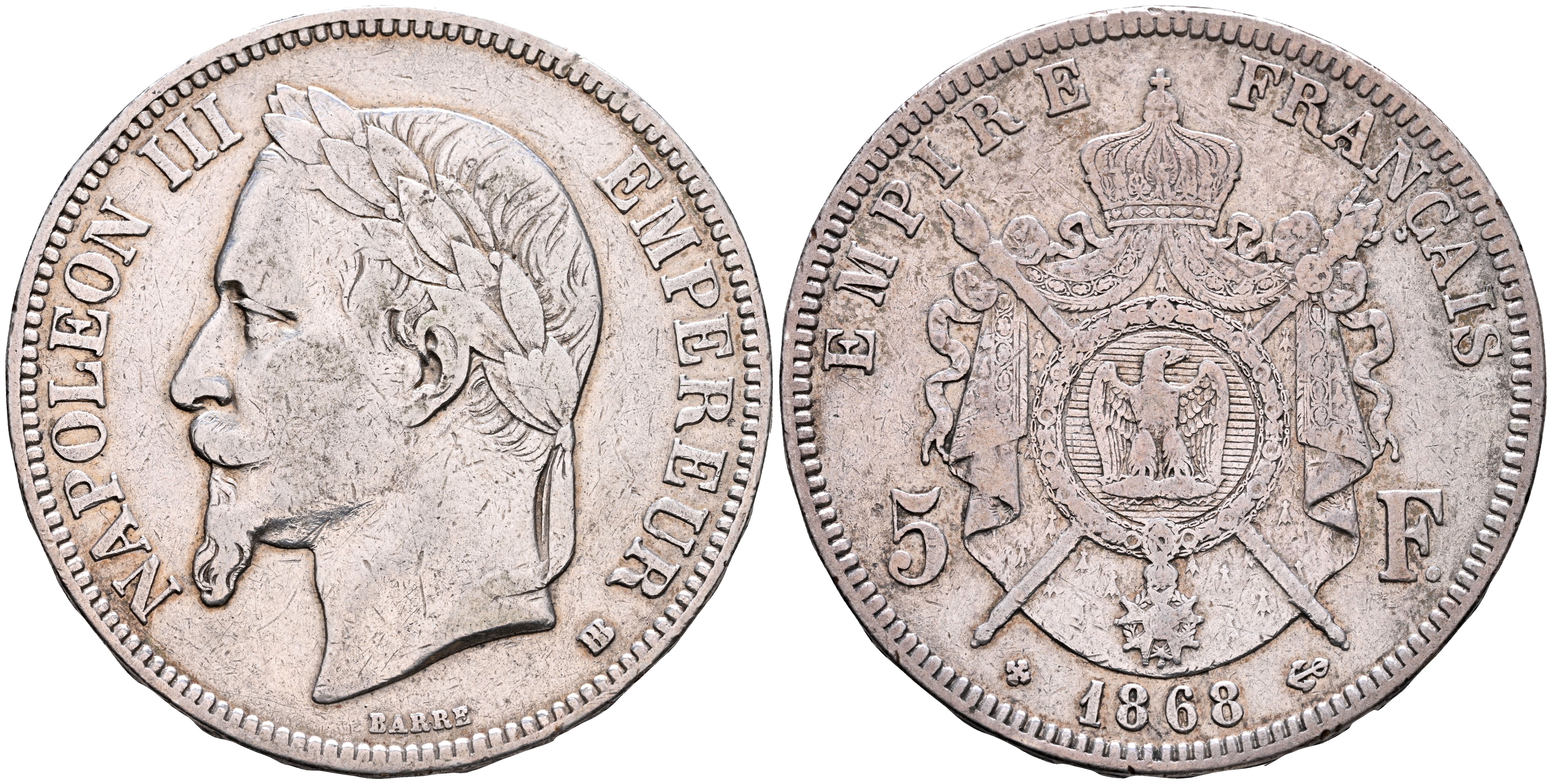 FRANCIA, Napoleón III. 5 Francs. (Ar. 24,75g/37mm). 1868. Estrasburgo BB. (Km#799.2). MBC.