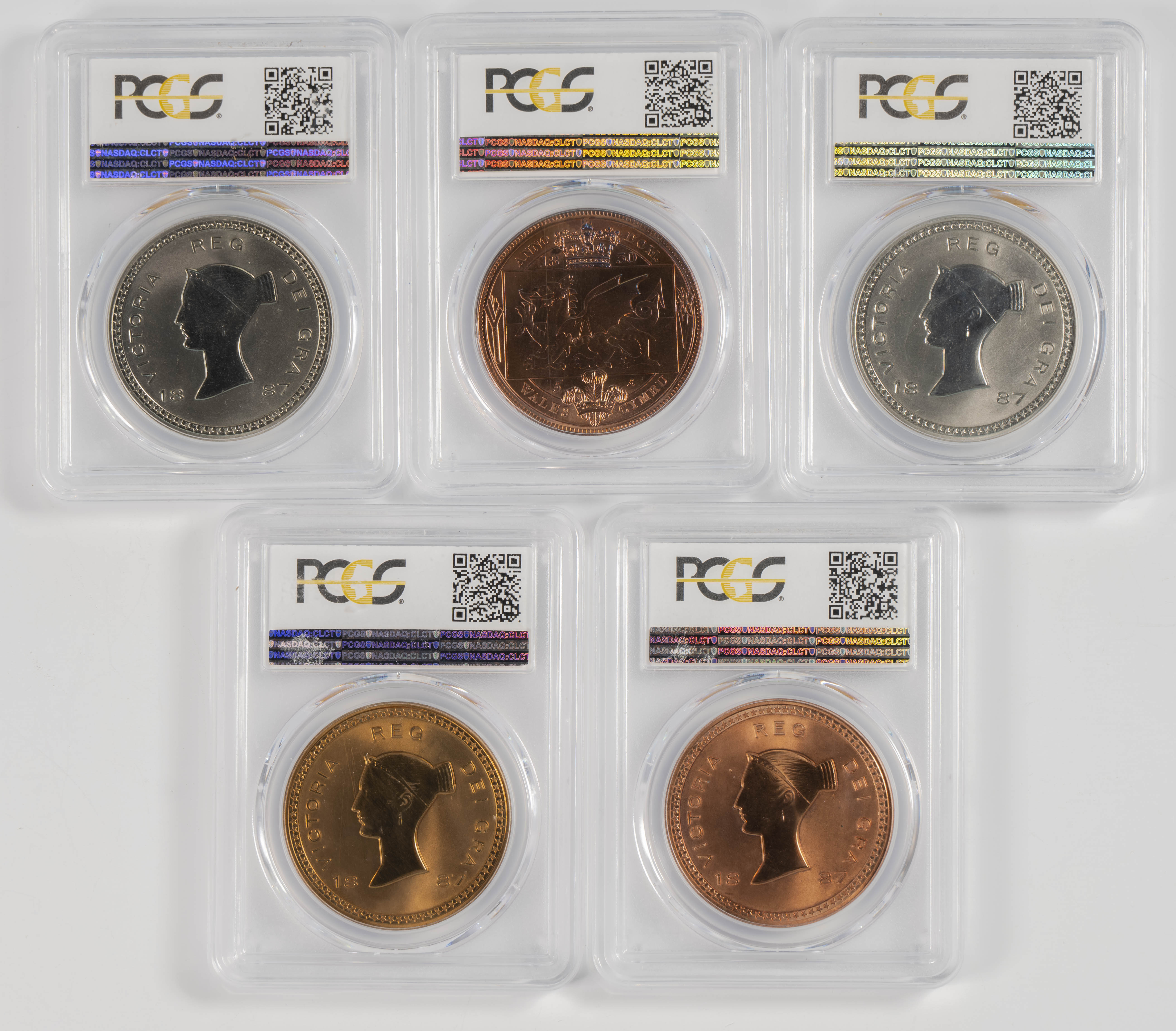 GRAN BRETAÑA. Conjunto de 5 reacuñaciones modernas de Coronas británicas de 1830 y 1887 (2008). Solo una pieza repetida con variedas de materiales de acuñación (níquel, latón y cobre). Todas las monedas están encapsuladas por PCGS con diferentes graduaciones entre PR64 y MS68. A EXAMINAR.