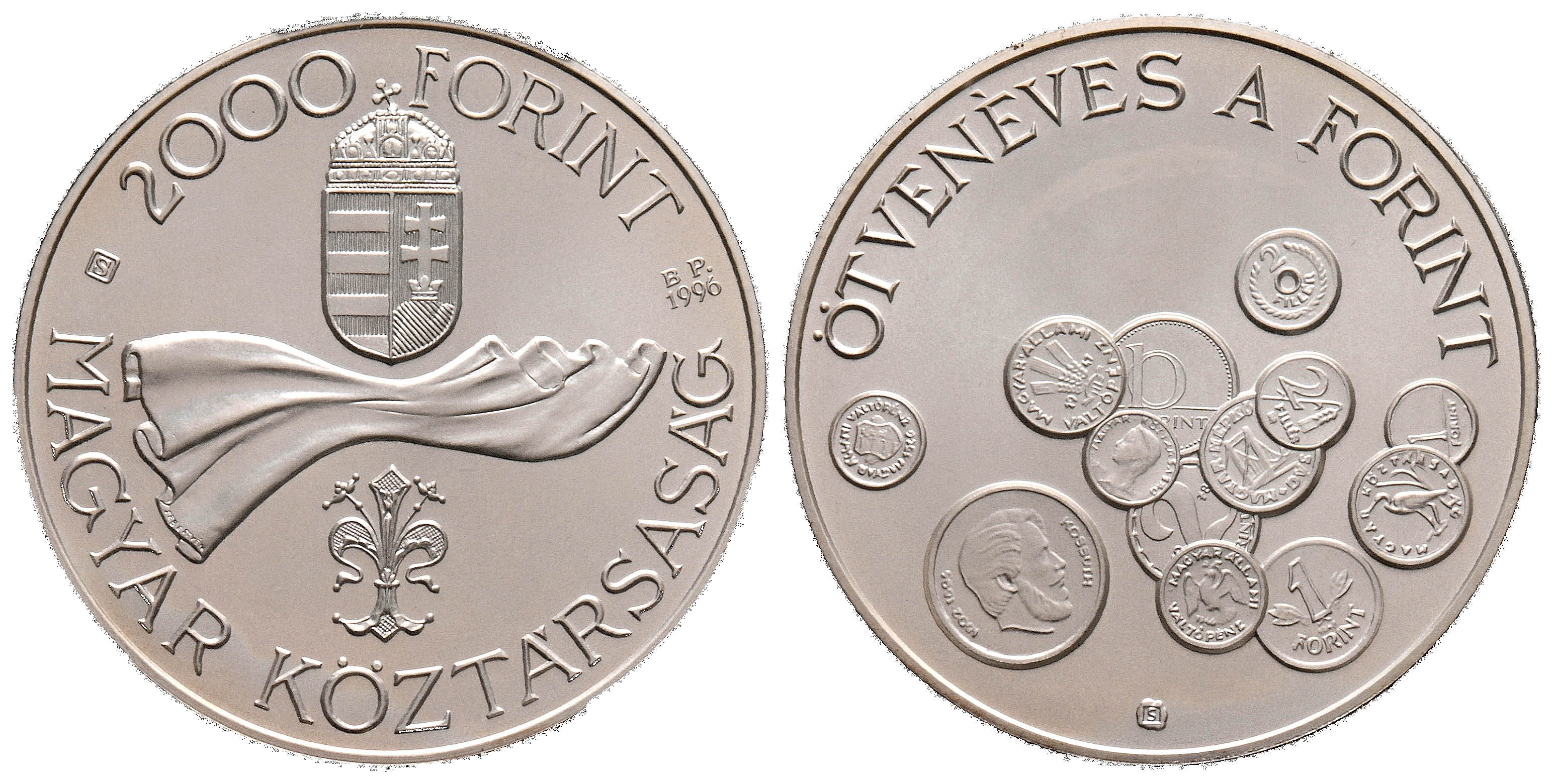 HUNGRÍA. 2000 Forint. (Ar. 31,46g/39mm)*. 1996. 50 Aniversario del Forint. (Km#717). Encapsulado por PCGS PR 67DCAM. *Peso y medidas teóricos. Escasa.