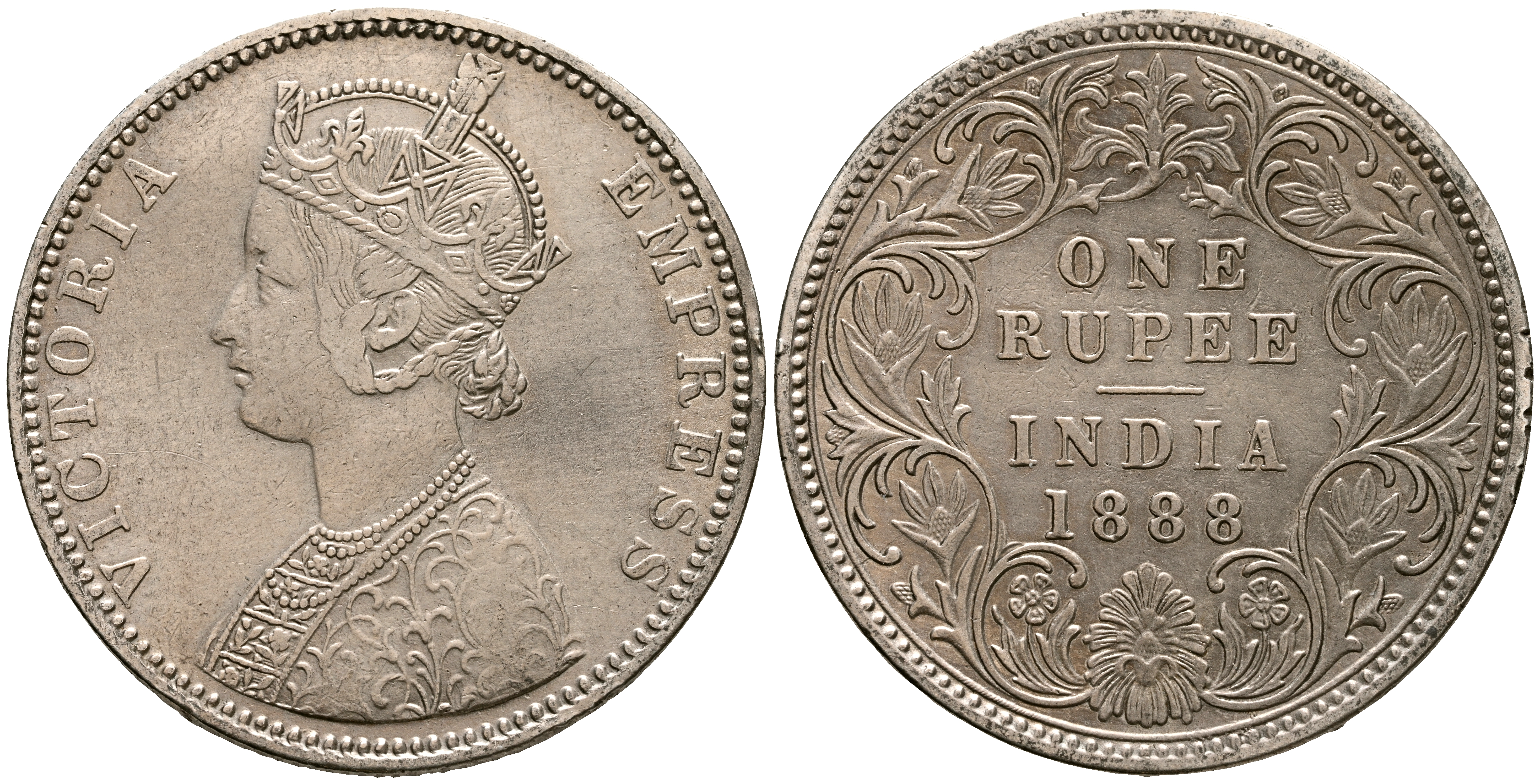 INDIA (Británica), Reina Victoria. 1 Rupia. (Ar. 11,53g/30mm). 1888. (Km#492). MBC+.