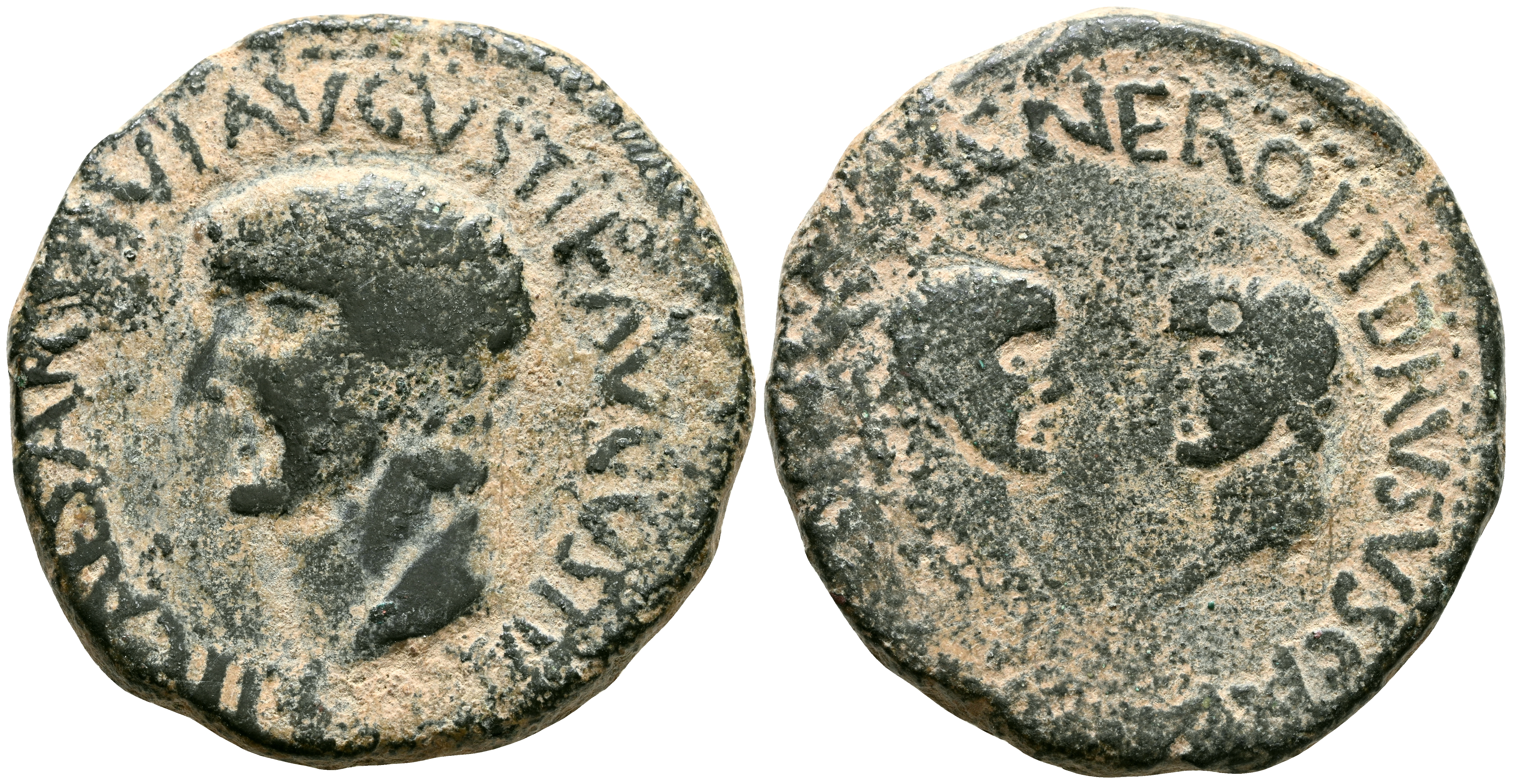 CARTAGONOVA (Cartagena, Murcia). As. (Ae. 14,65g/29mm). 14-36 d.C. (FAB-600). Anv: Cabeza de Tiberio a izquierda, alrededor leyenda: TI CAESAR DIVI AVGVSTI F AVGVSTVS. Rev: Cabezas enfrentadas de Nero y Druso, alrededor leyenda: NERO ET DRVSO CAESARES QVINQ C V I N C. MBC-.