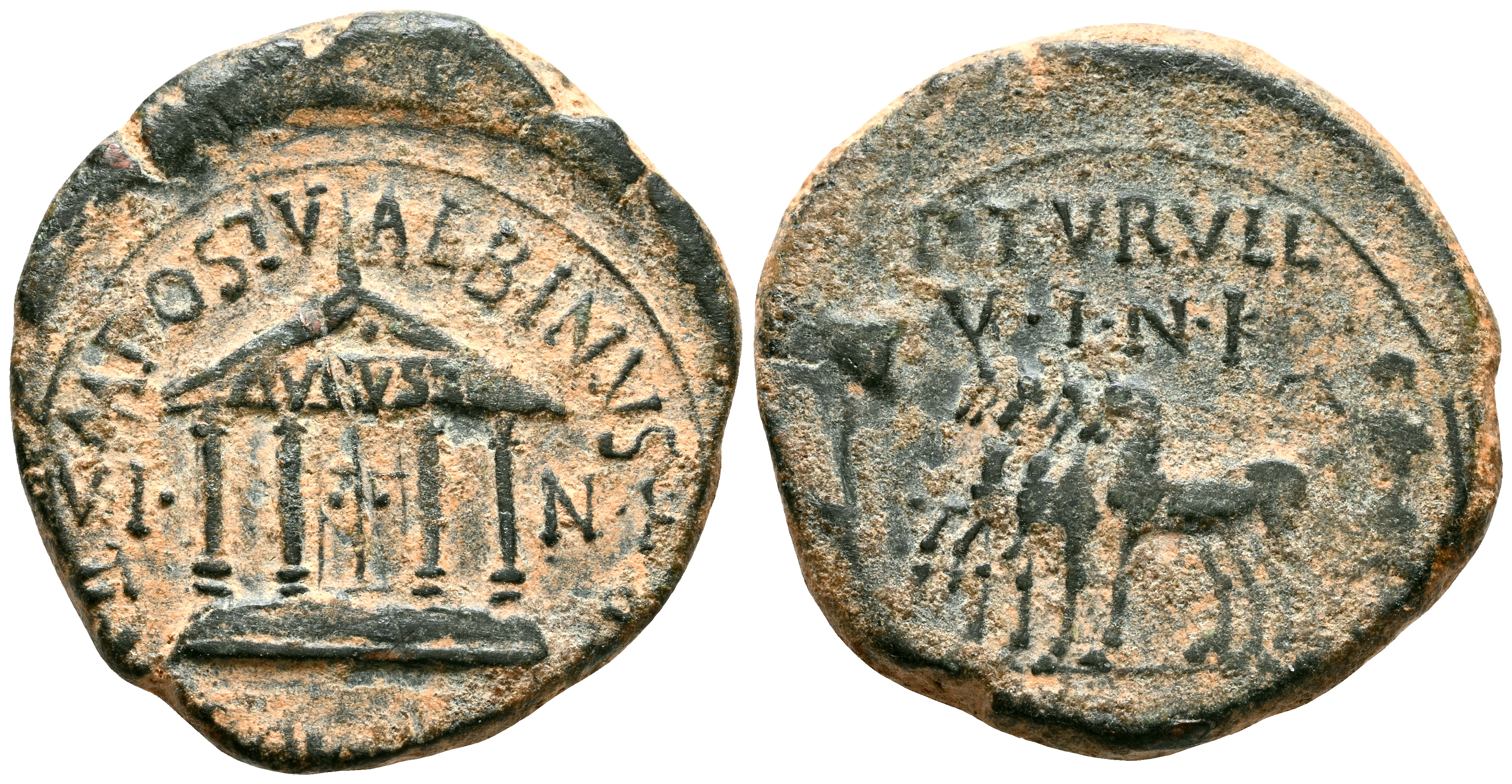 CARTAGONOVA (Cartagena, Murcia). Semis. (Ae. 4,99g/20mm). 14-36 d.C. (FAB-603). Anv: Templo tetrástilo con inscripción: AVGVSTO, entre: VI-NK, alrededor leyenda: M POSTV ALBINVS II VIR QVINQ ITER. Rev: Cuádriga a izquierda, delante vexilo, encima y debajo leyenda: P TVRVLL VINK/II VIR QVINQ ITER. MBC.