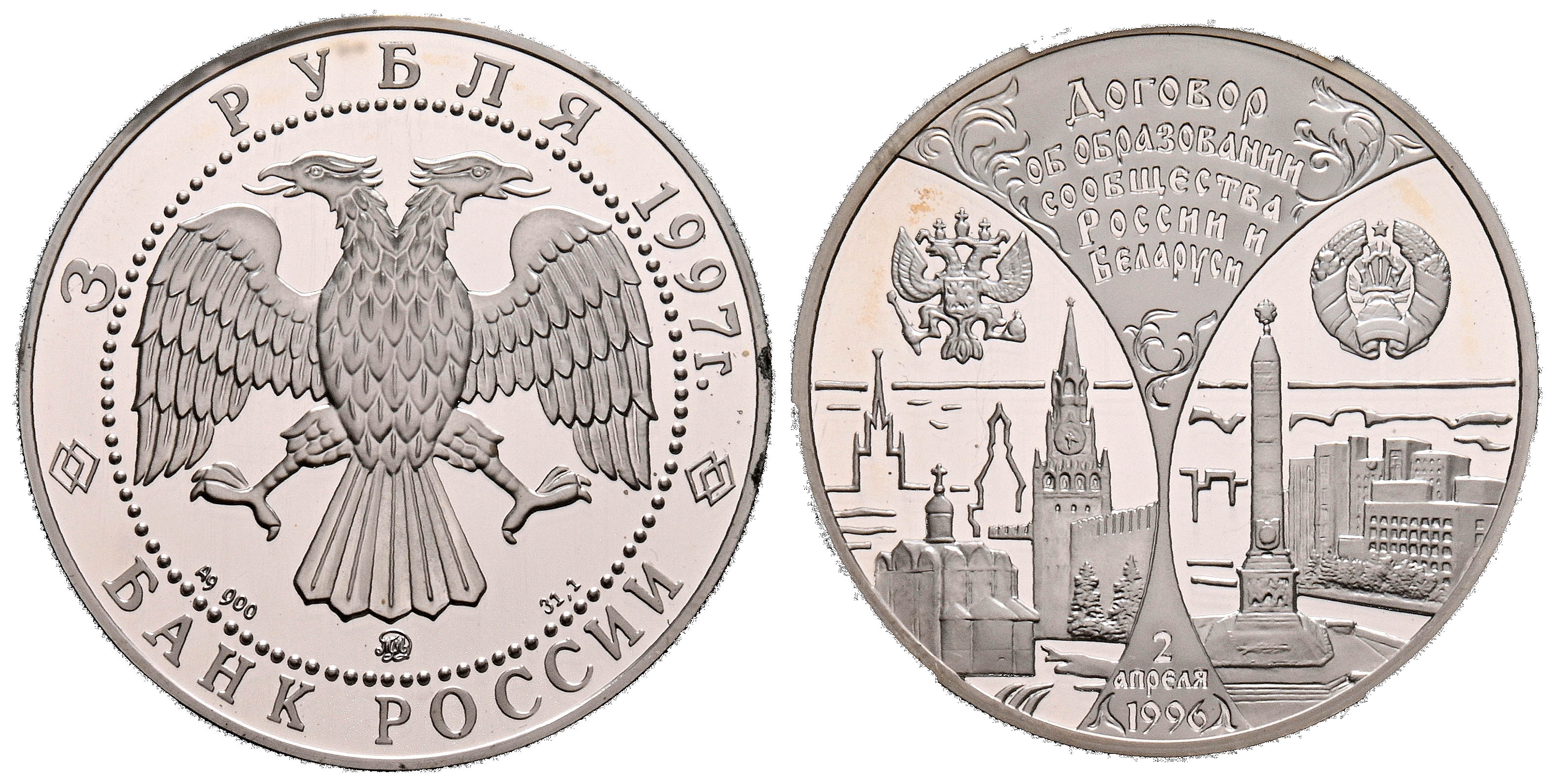 RUSIA. 3 Rublos. (Ar. 34,88g/39mm)*. 1997. Russia Belarus Treaty. (Km#575). Encapsulado por PCGS PR 68DCAM. *Peso y medidas teóricos.