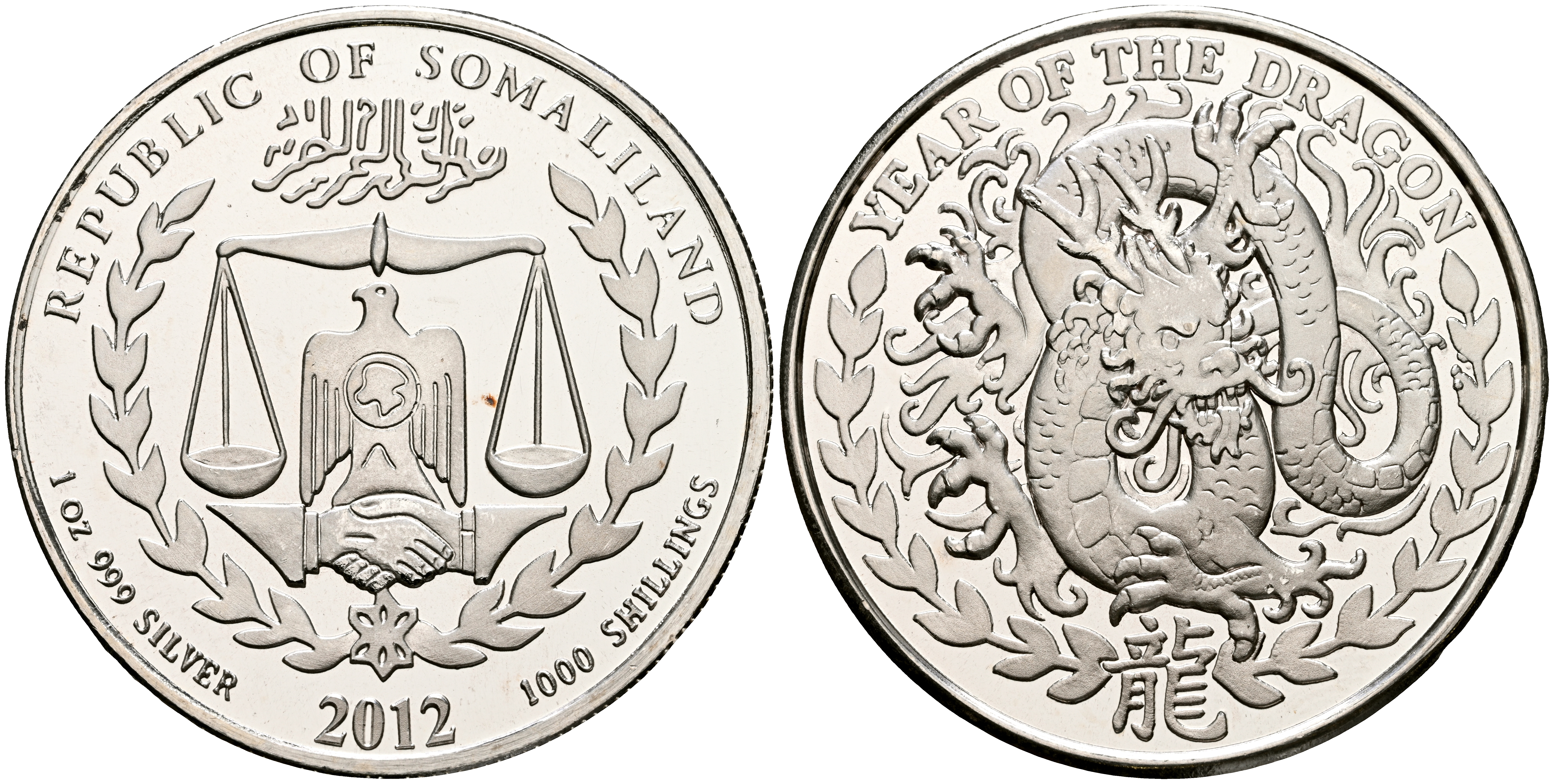 SOMALILANDIA. 100 Shillings. (Ar. 31,14g/39mm). 2012. Año del Dragón. (Km#107). PROOF. Escasa.