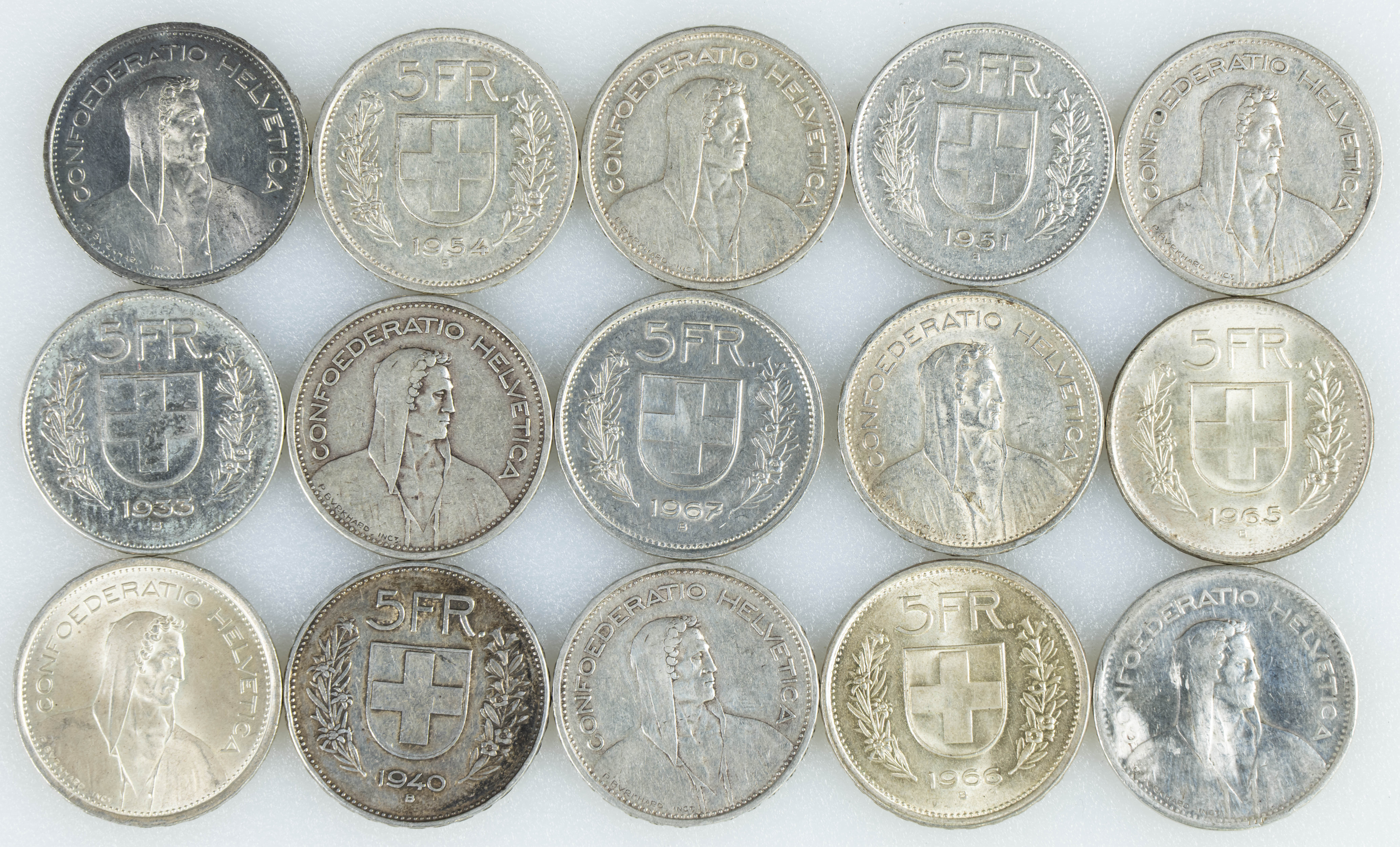 SUIZA. Conjunto de 15 monedas de plata de 5 Francs, sin piezas repetidas, con fechas comprendidas entre 1931 y 1969. Diferentes estados de conservación. A EXAMINAR.