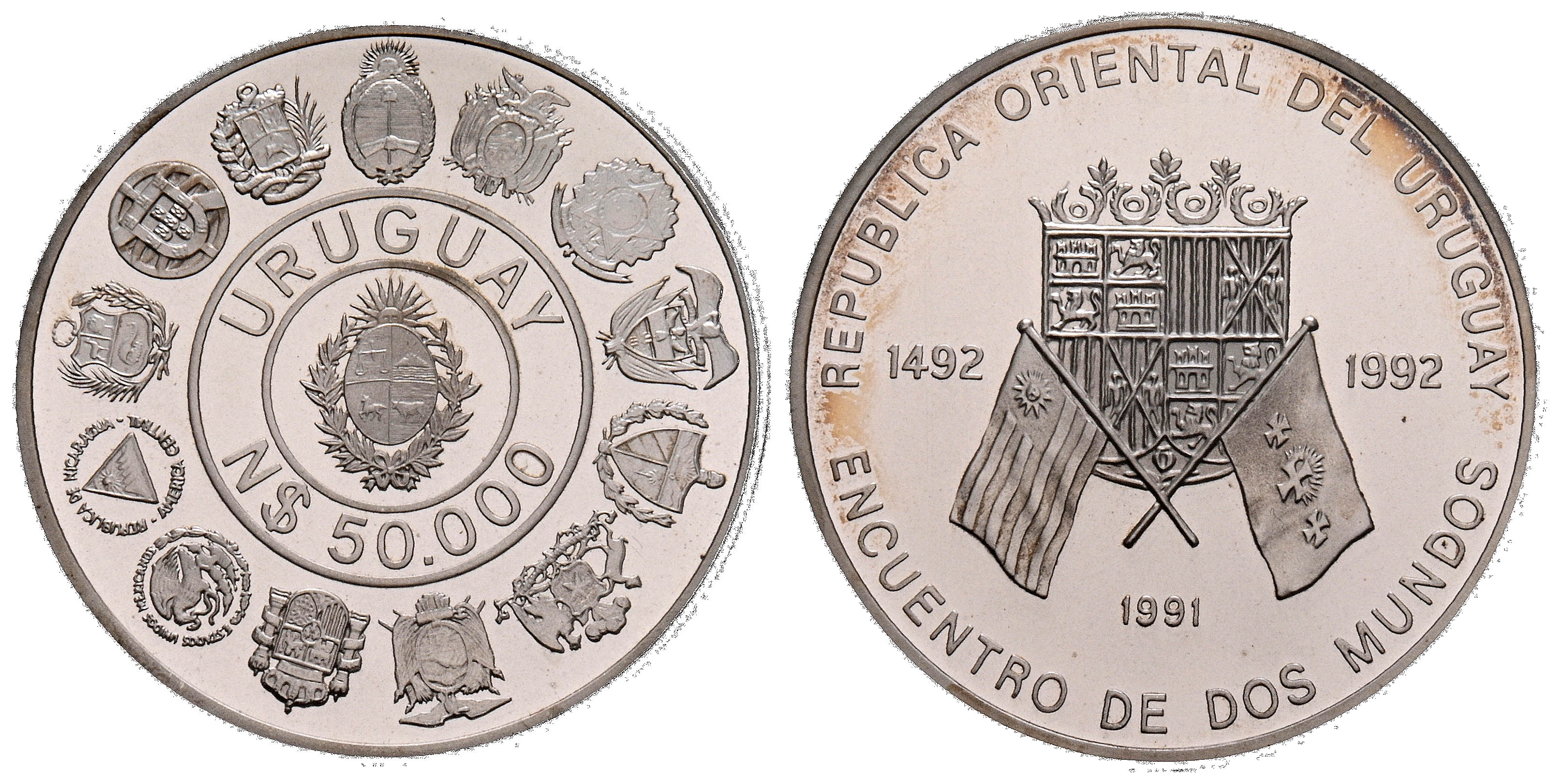 URUGUAY. 50.000 Nuevos Pesos. (Ar. 27,00g/40mm)*. 1991. Encuentro de Dos Mundos. (Km#100). Encapsulada por PCGS PR 64DCAM. *Peso y medidas teóricos. Escasa.