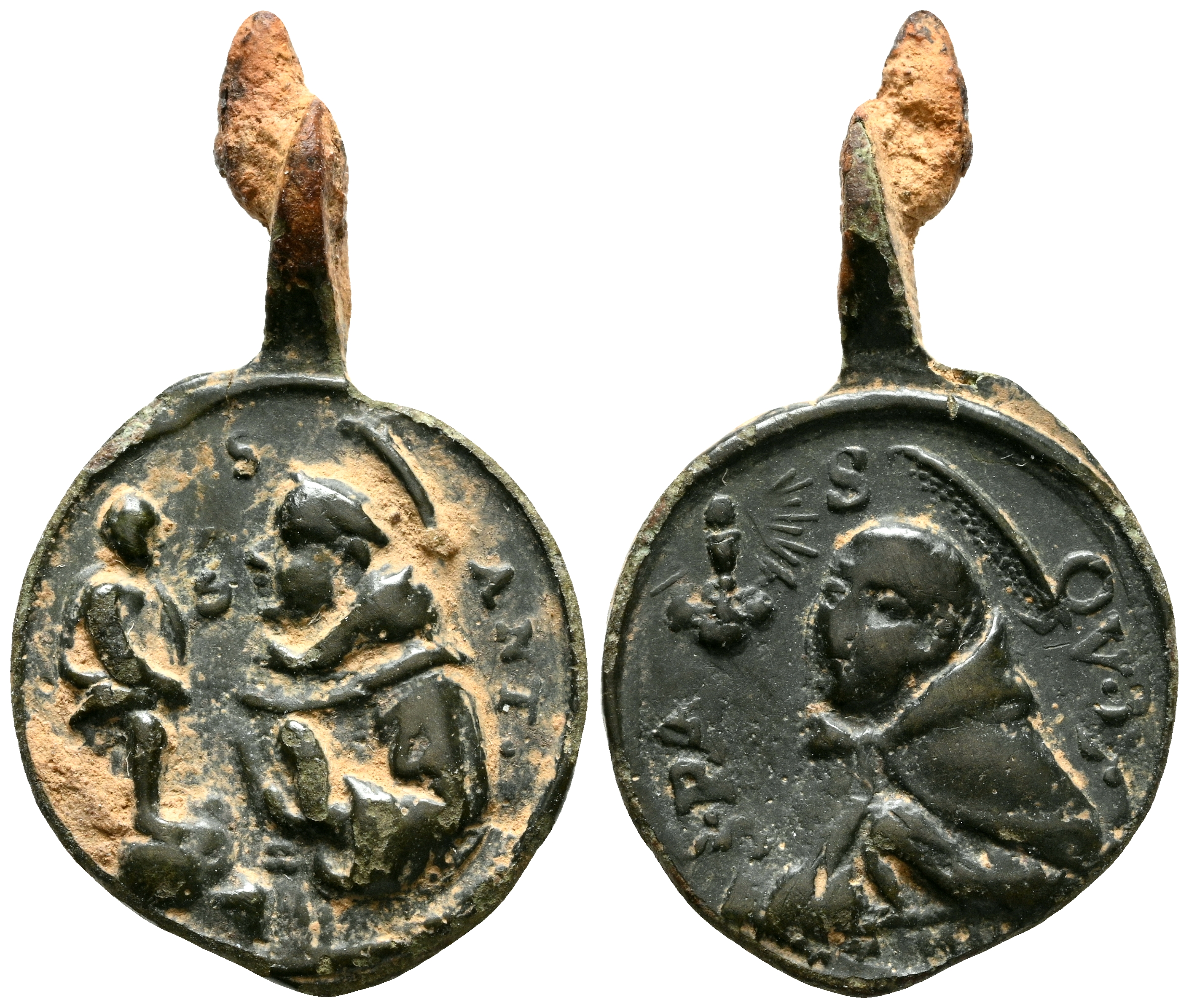 MEDALLA DEVOCIONAL. (Ae. 1,40g/24x14mm). Siglo XVI-XIX. Anv: San Antonio con el Niño Jesús. Rev: San Pascual Bailón. MBC.