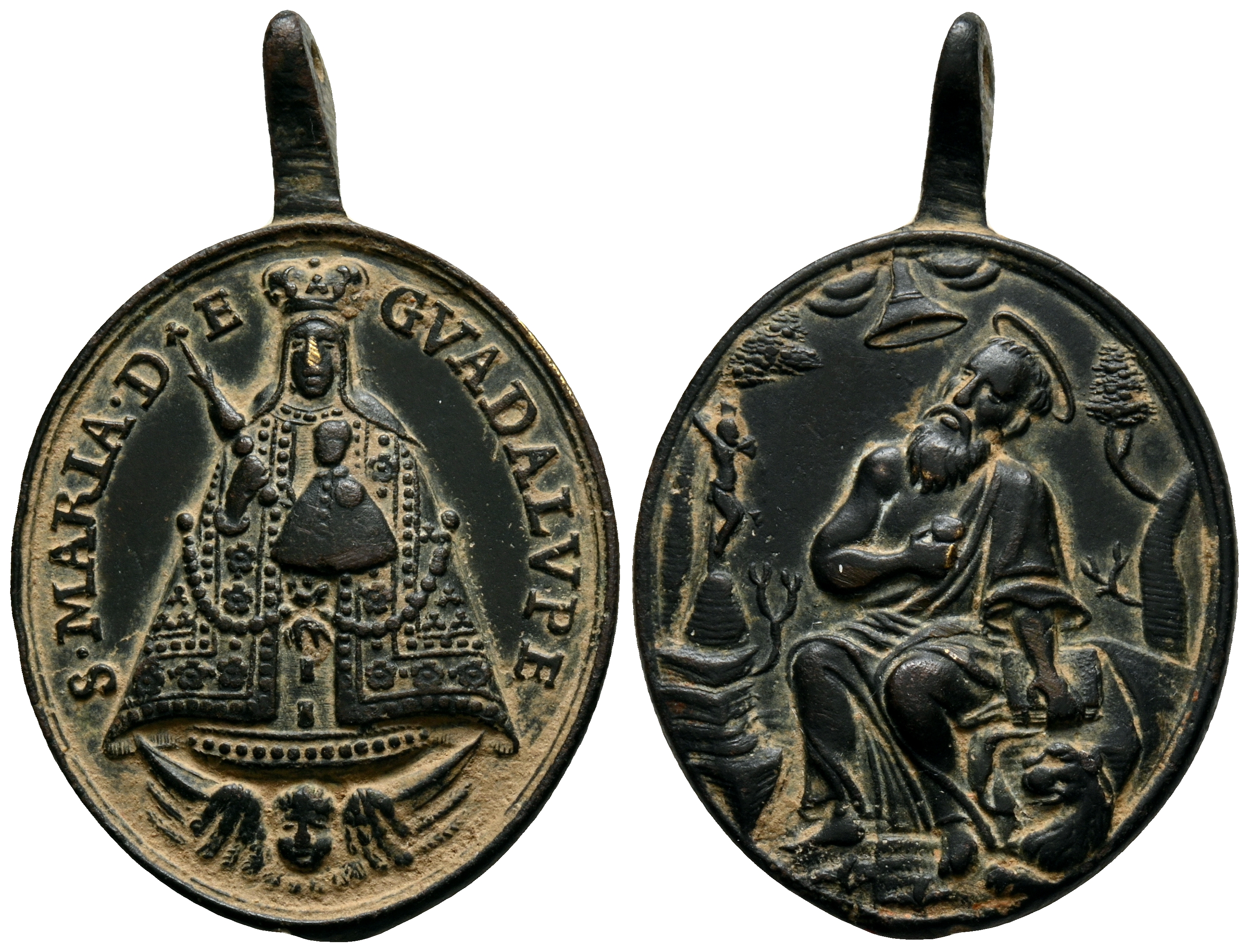 MEDALLA DEVOCIONAL. (Ae. 13,98g/45x29mm). Siglo XVI-XIX. Anv: Virgen de Guadalupe, alrededor: S. MARIA. DE. GVADALVPE. Rev: San Jerónimo penitente. MBC+. Atractivo ejemplar.