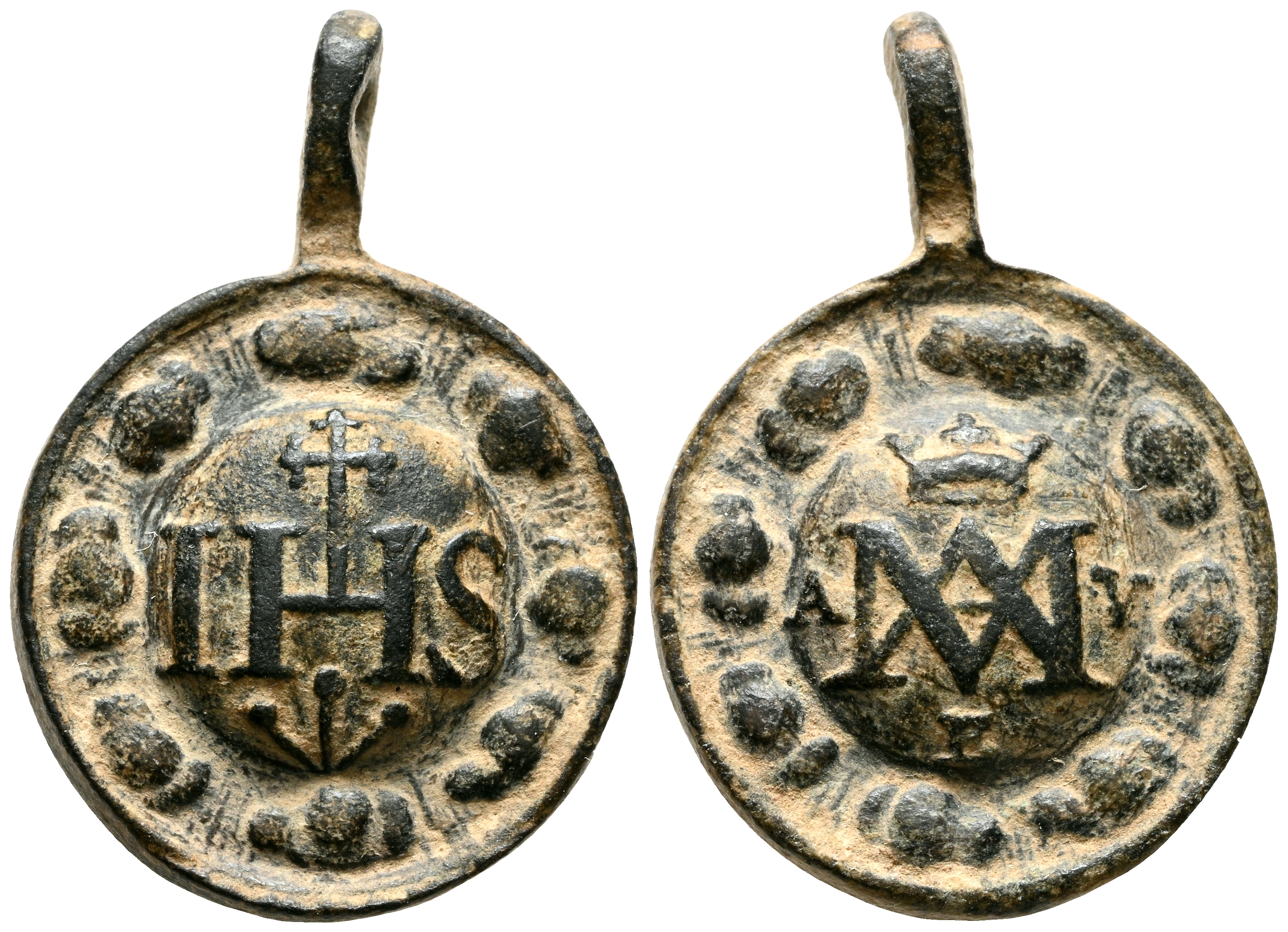 MEDALLA DEVOCIONAL. (Ae. 3,43g/23x16mm). Siglo XVI-XIX. Anv: Anagrama IHS. Rev: Anagrama de la Virgen María coronado, alrededor A/V/E. MBC+.