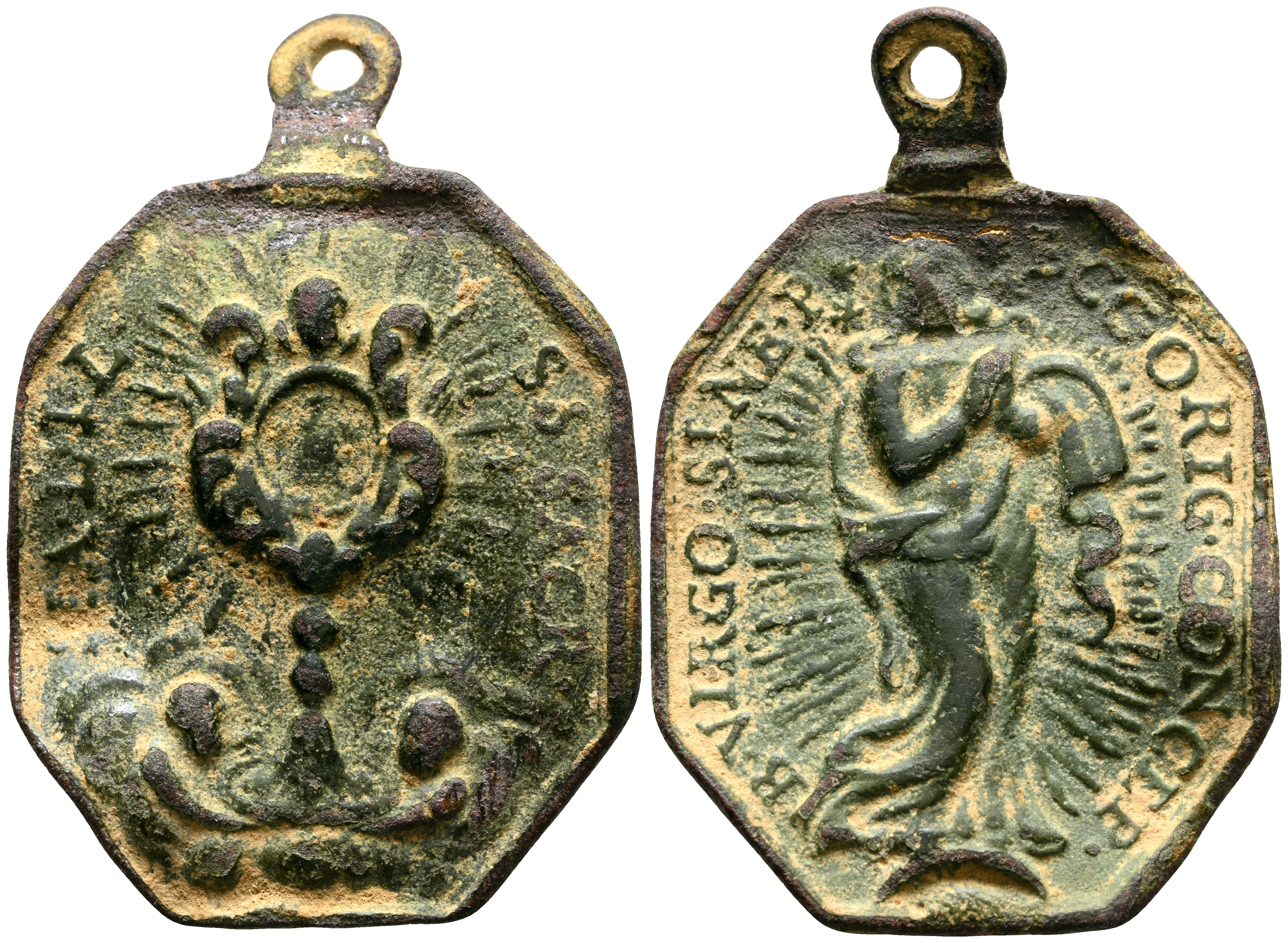 MEDALLA DEVOCIONAL. (Ae. 5,34g/35x25mm). Siglo XVI-XIX. Anv: Custodia, alrededor: SIA. L. IL. SS SACR. Rev: Inmaculada, alrededor: B. VIRGO.SINE. PCC. ORIG. COMCEP. MBC. Alabeada.