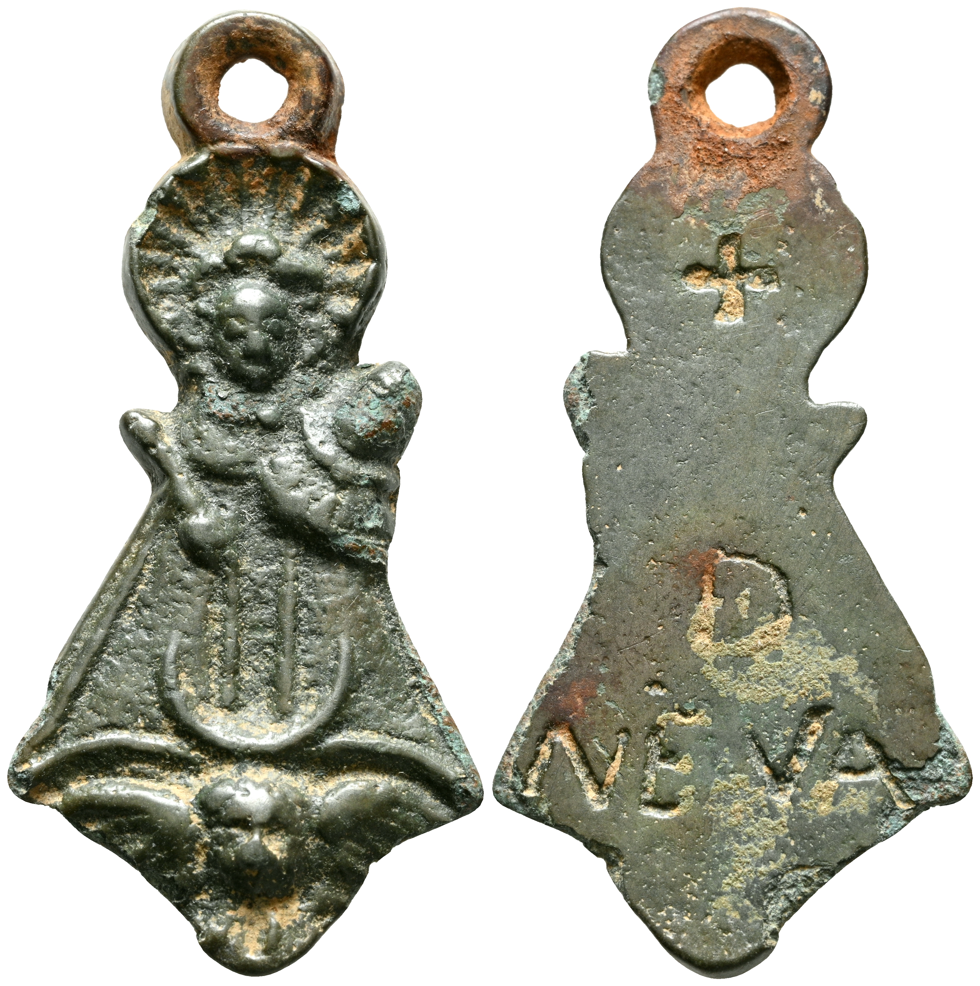 IMAGEN-MEDALLA. (Ae. 2,95g/34x17mm). Siglo XVI-XIX. Virgen con niño y cetro, sobre peana con querubín, detrás inscripción: + / DE / NEVA. MBC+.