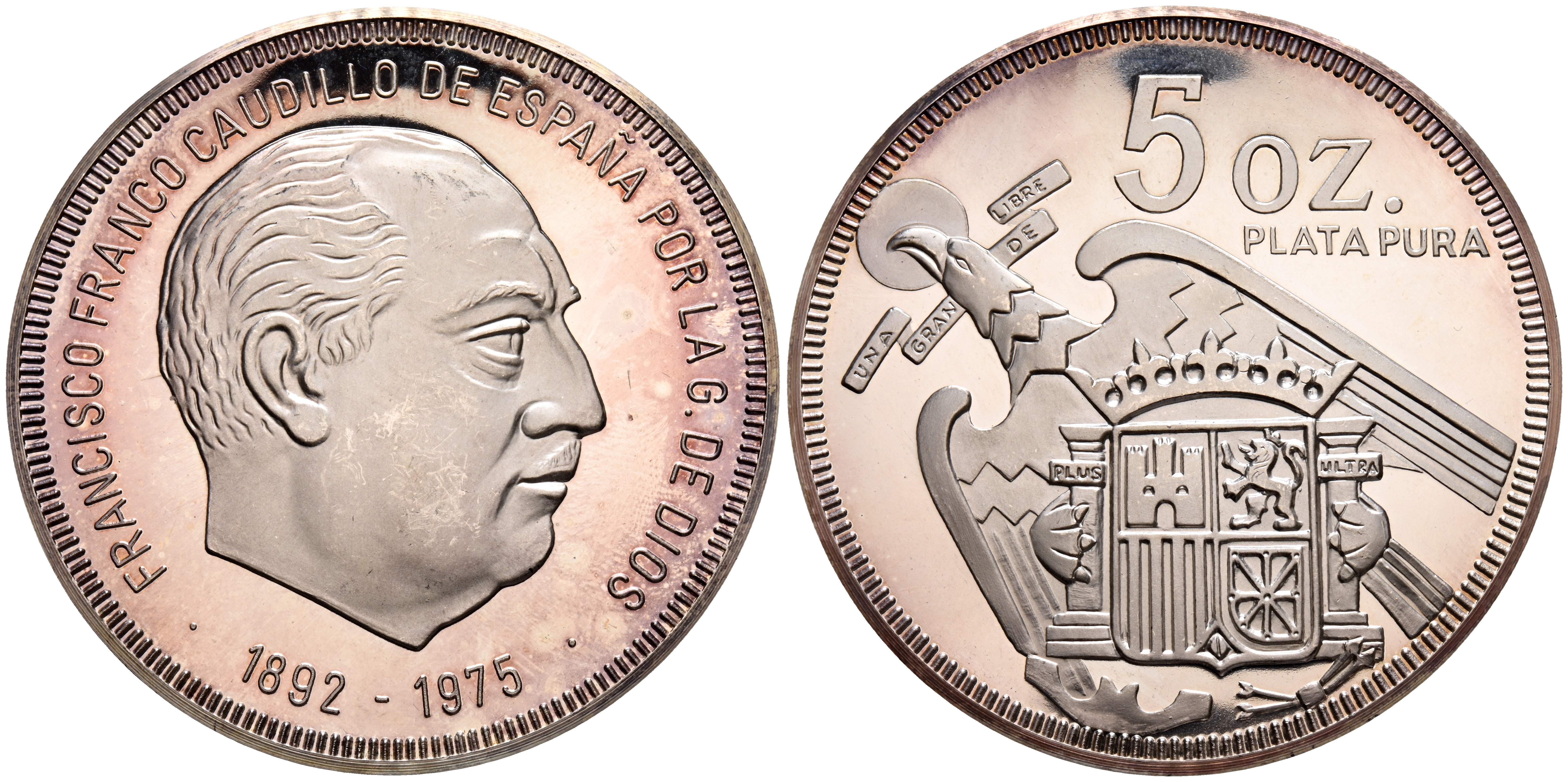 ESTADO ESPAÑOL (1936-1975). 5 Onzas. (Ar. 155,04g/65mm). S/D. Medalla privada. Plata pura. PROOF.