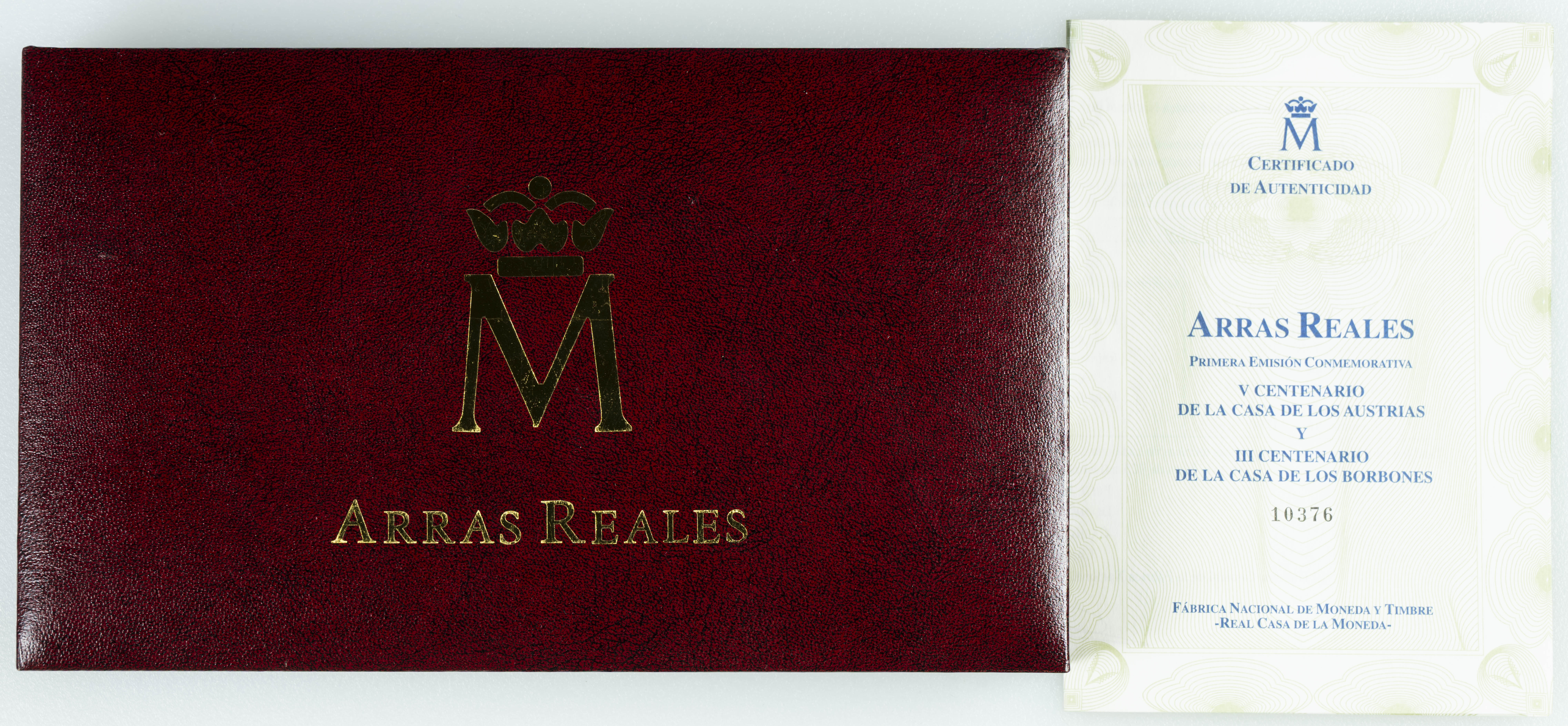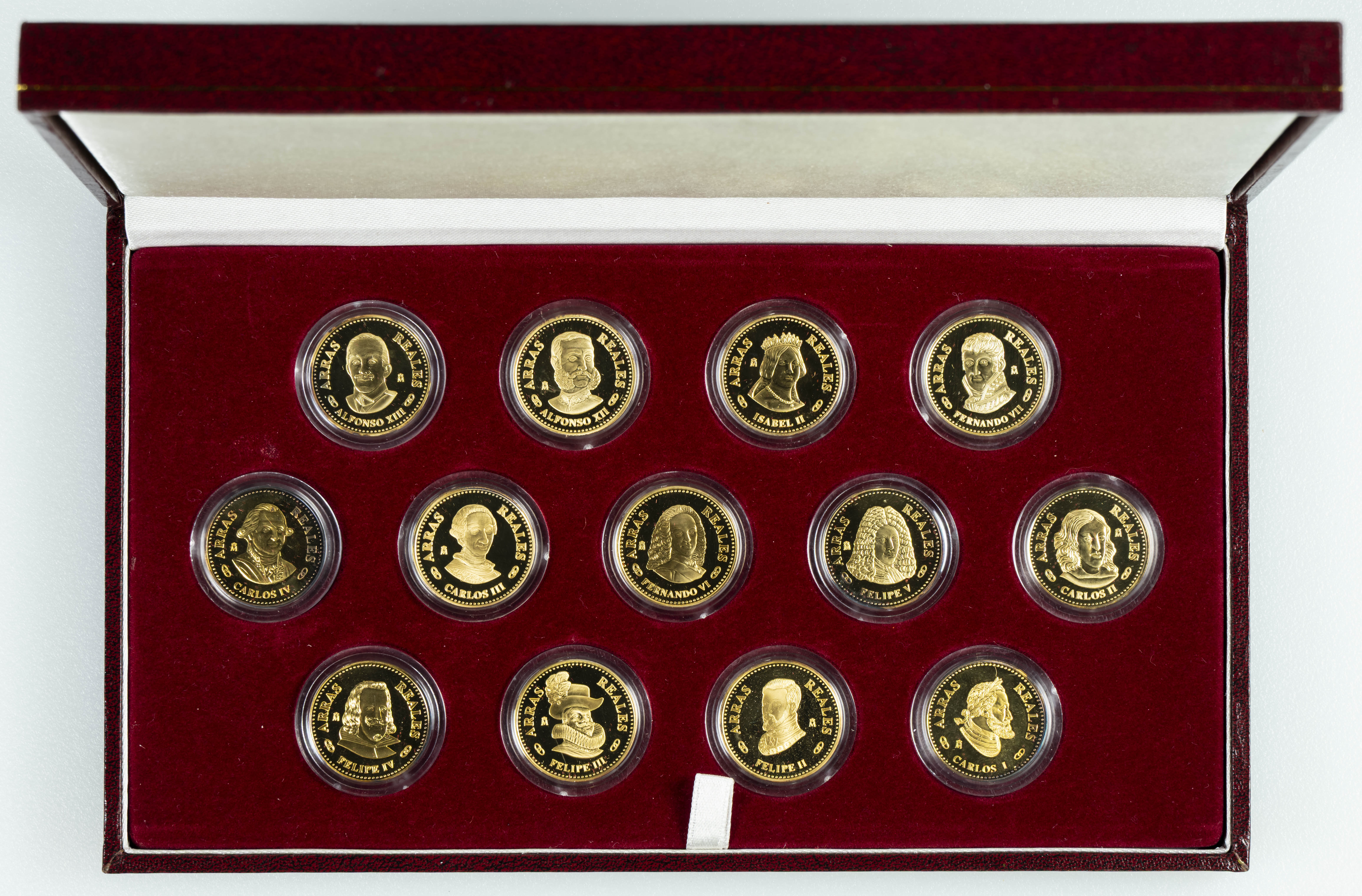 ESPAÑA. 13 Arras reales en plata dorada conmemorativas del V Centenario de la Casa de Austria y III Centenario de la Casa de Borbón. FNMT. PROOF. Incluye estuche original y certificado de autenticidad.