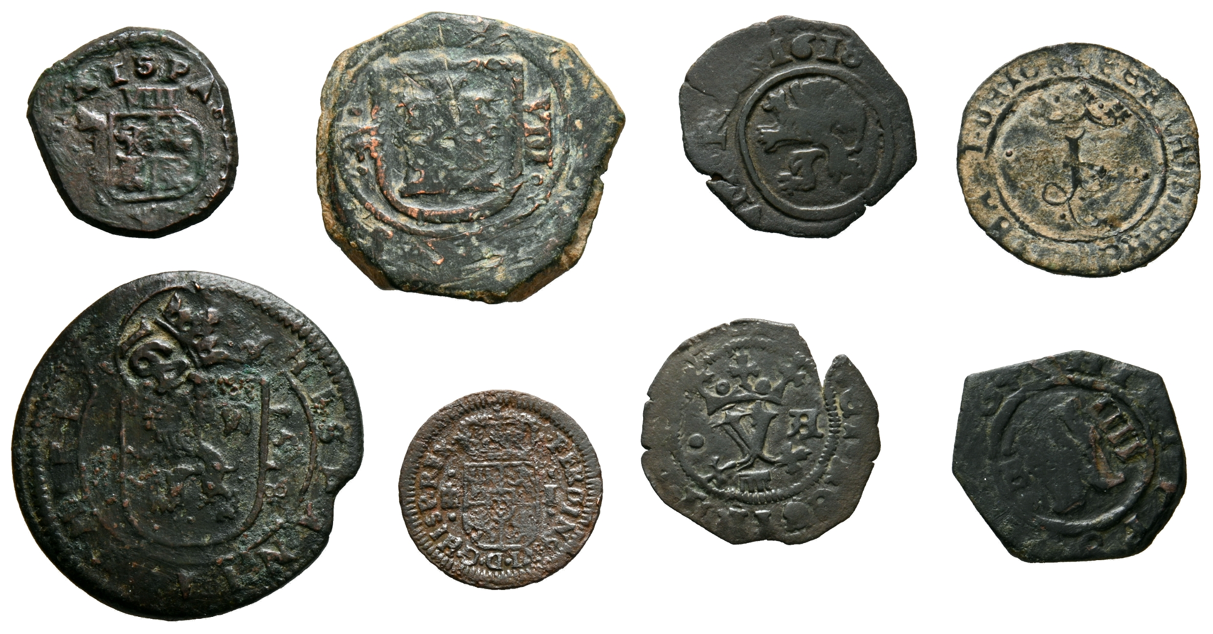 MONARQUIA ESPAÑOLA. Interesante conjunto formado por 8 cobres y vellones acuñados desde la época de los RRCC hasta los Borbones. Diferentes módulos y fechas incluyendo una bonita pieza con resello. Diferentes estados de conservación. A EXAMINAR.