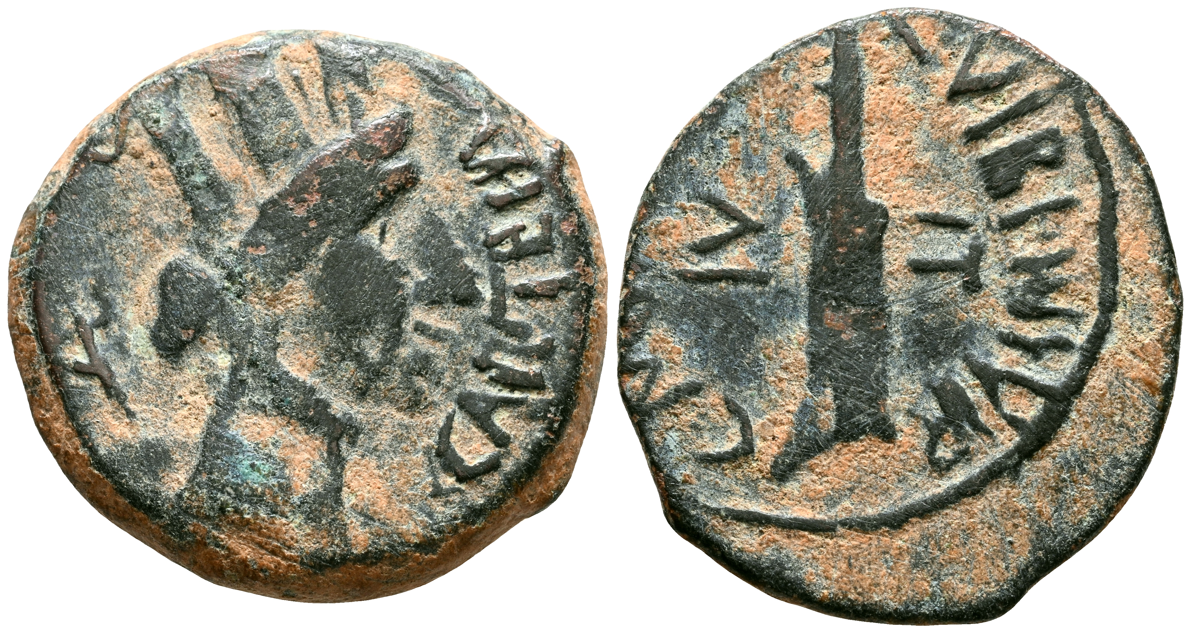 CARTEIA (San Roque, Cádiz). Semis. (Ae. 5,08g/21mm). 27 a.C.-14 d.C. (FAB-667 var). Anv: Cabeza femenina con corona mural a derecha, detrás tridente, delante leyenda: CARTEIA. Rev: Timón entre: IV-IT, alrededor leyenda: C VIBI VIR IIII C MINIVS IIII VIR. MBC-. Escaso.